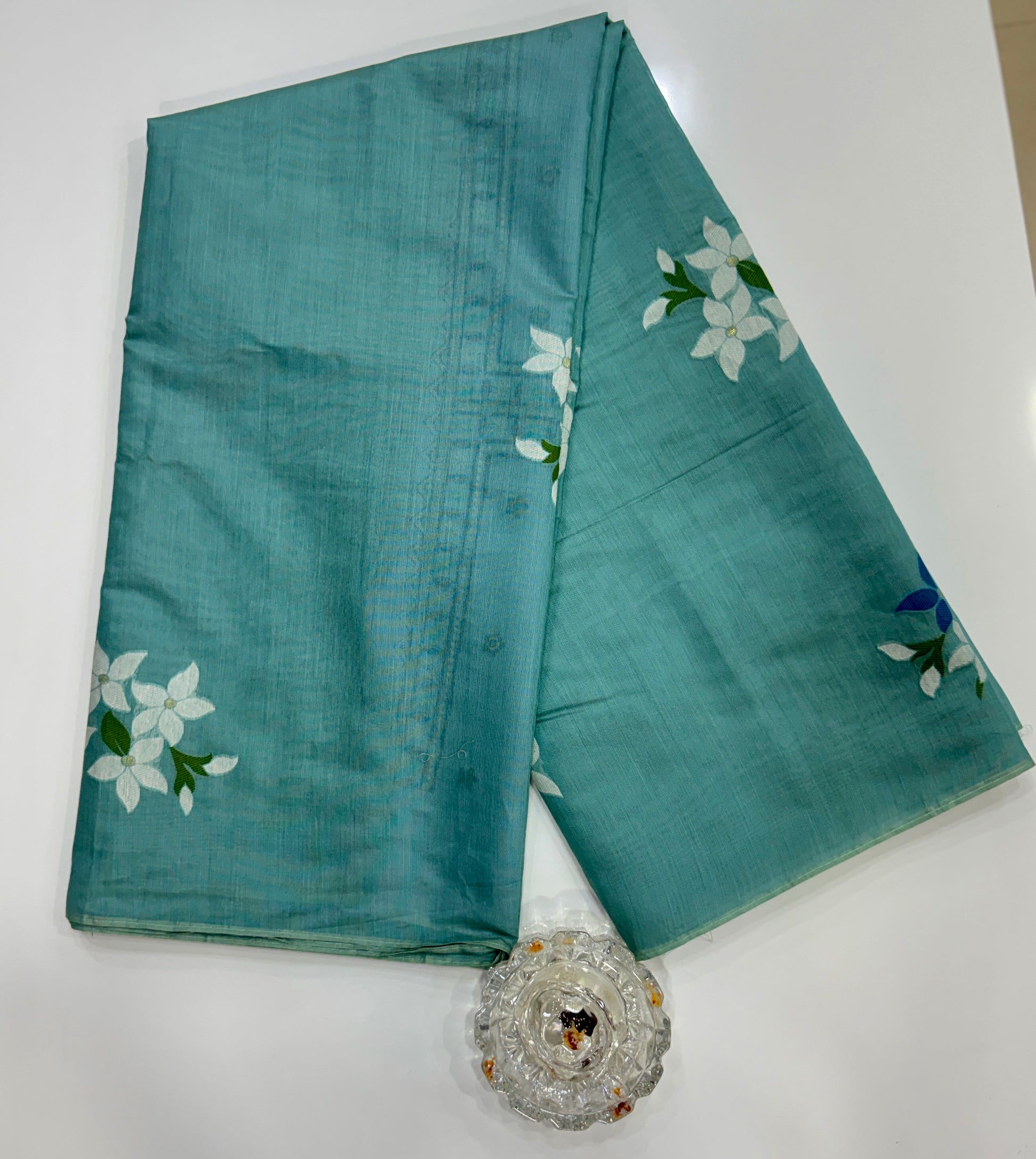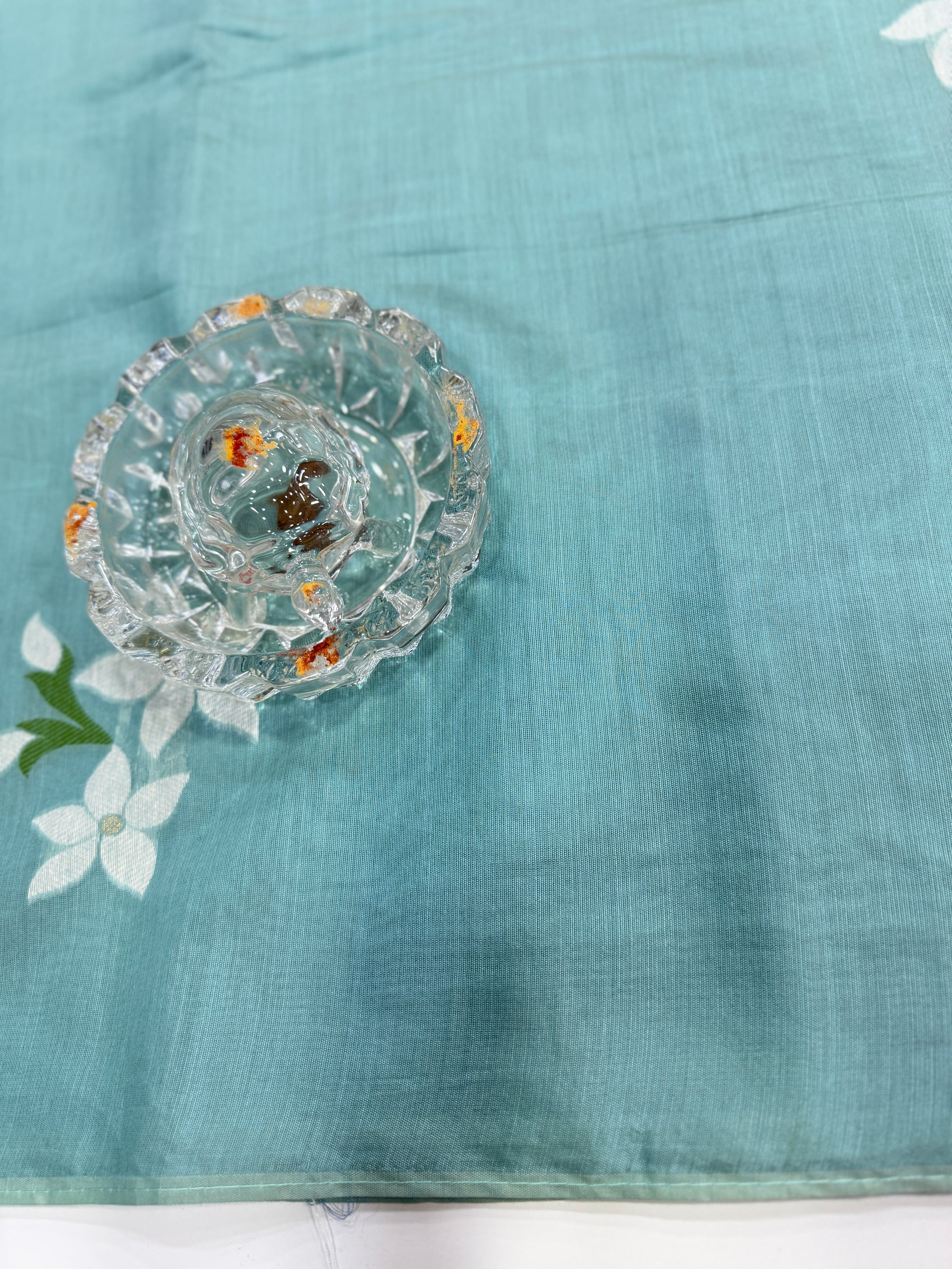 This aqua blue saree is crafted in a viscose-cotton blend fabric that mirrors the elegant finish of kora silk. The serene blue shade is complemented by woven floral detailing placed along the body, creating an attractive balance between light colour and intricate craftsmanship. The pallu features tassels that add traditional charm to the saree’s fluid drape.