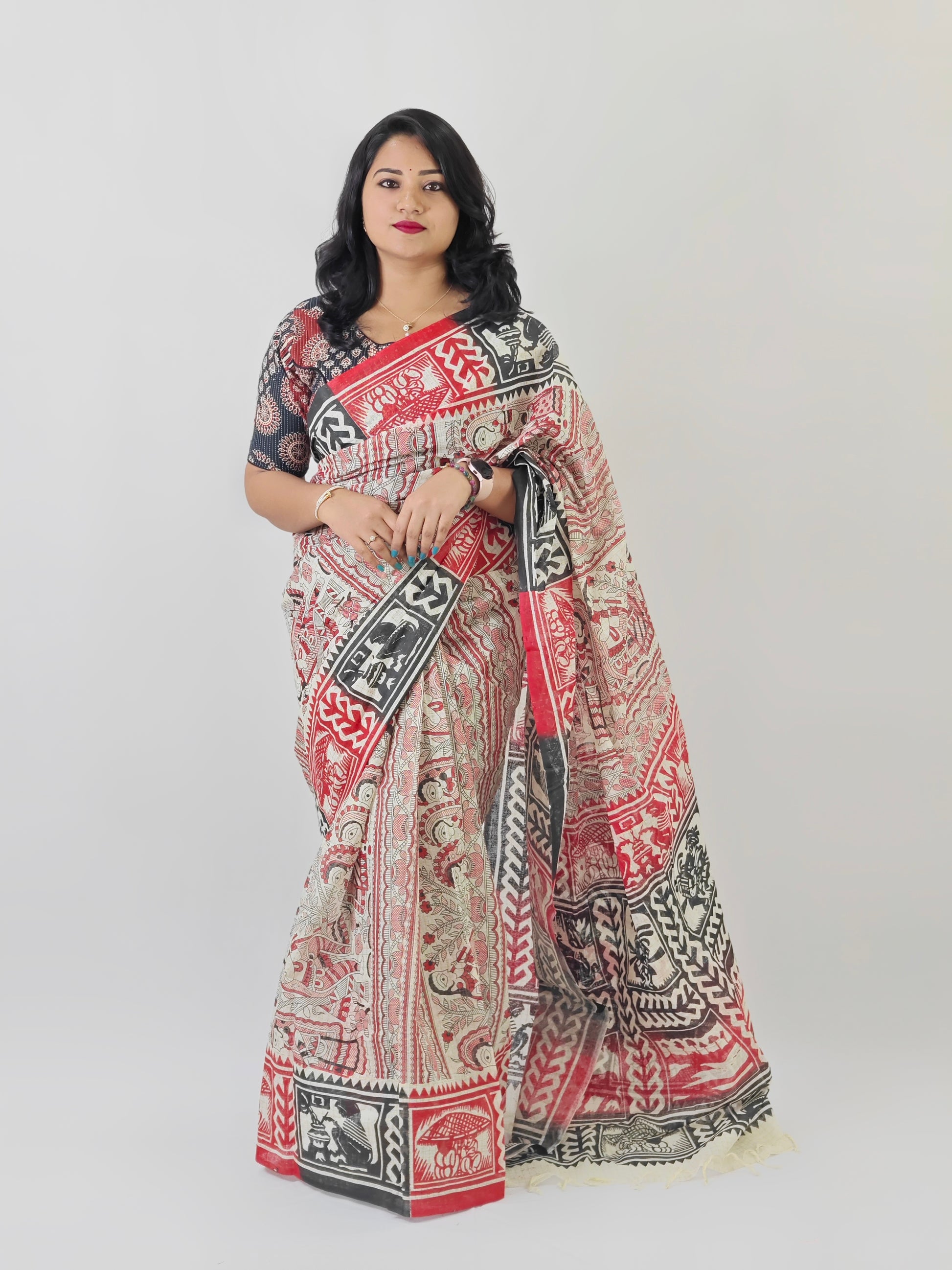 This saree is a celebration of Indian artistry, featuring Madhubani – Sohajpath hand block print motifs crafted on luxurious Begampur Zari Check fabric. Known for its intricate weave and subtle zari work, the fabric offers a refined sheen and rich texture. The hand block printing showcases detailed traditional designs, blending heritage craftsmanship with contemporary appeal. Perfect for weddings, festive gatherings, and cultural celebrations, this saree captures the timeless beauty of Madhubani art while providing a graceful drape for any special occasion.