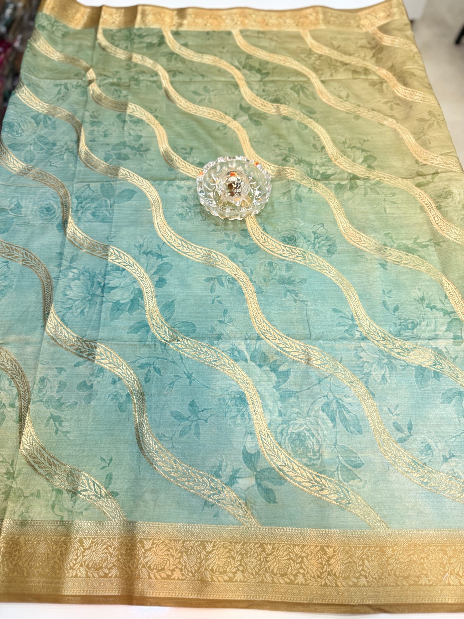 This saree is crafted from bamboo silk, providing a luxurious and breathable texture. It also features elegant floral digital prints on the body, along with a richly detailed pallu and coordinated border.