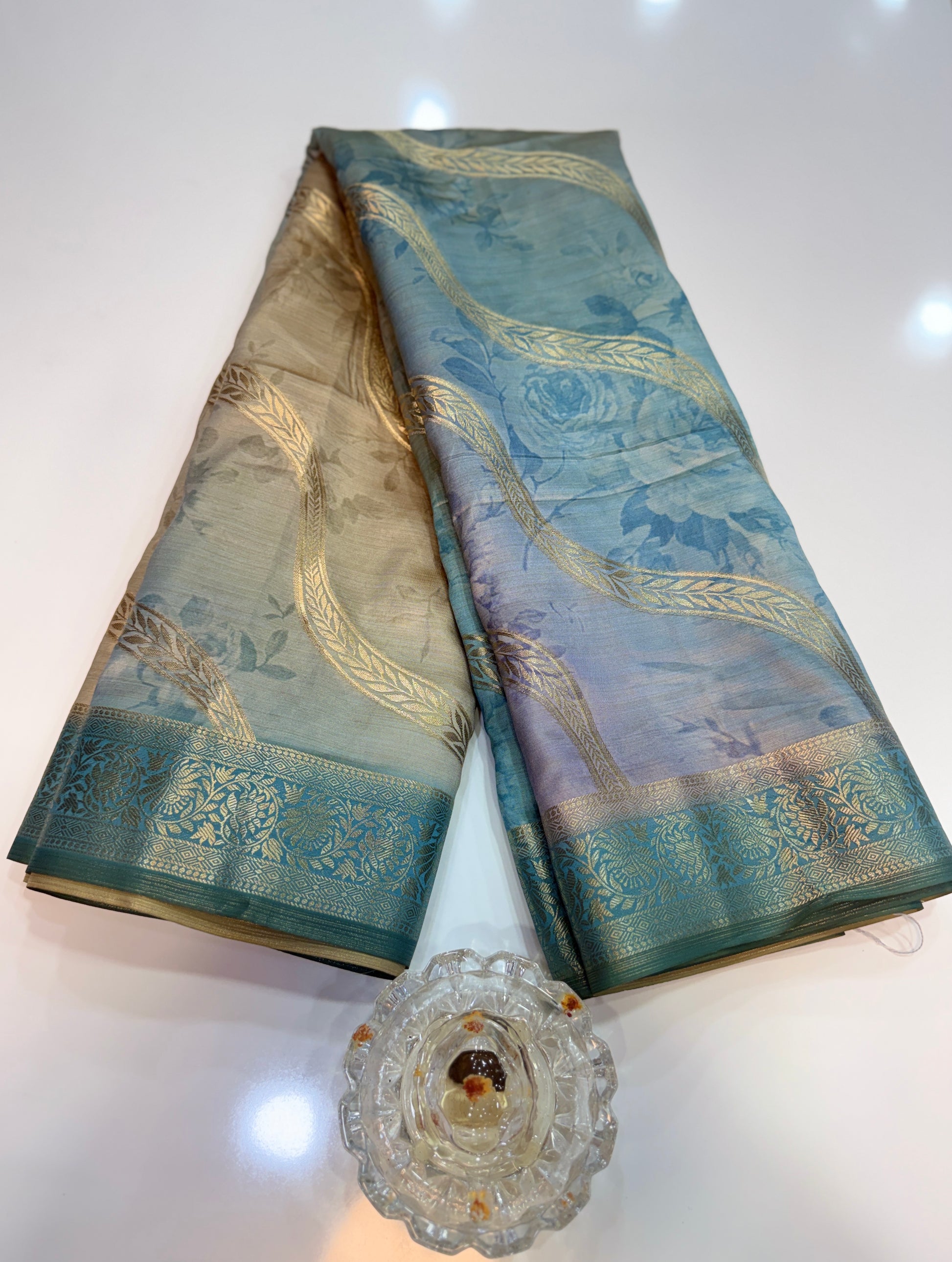 This saree is crafted from bamboo silk, providing a luxurious and breathable texture. It also features elegant floral digital prints on the body, along with a richly detailed pallu and coordinated border.