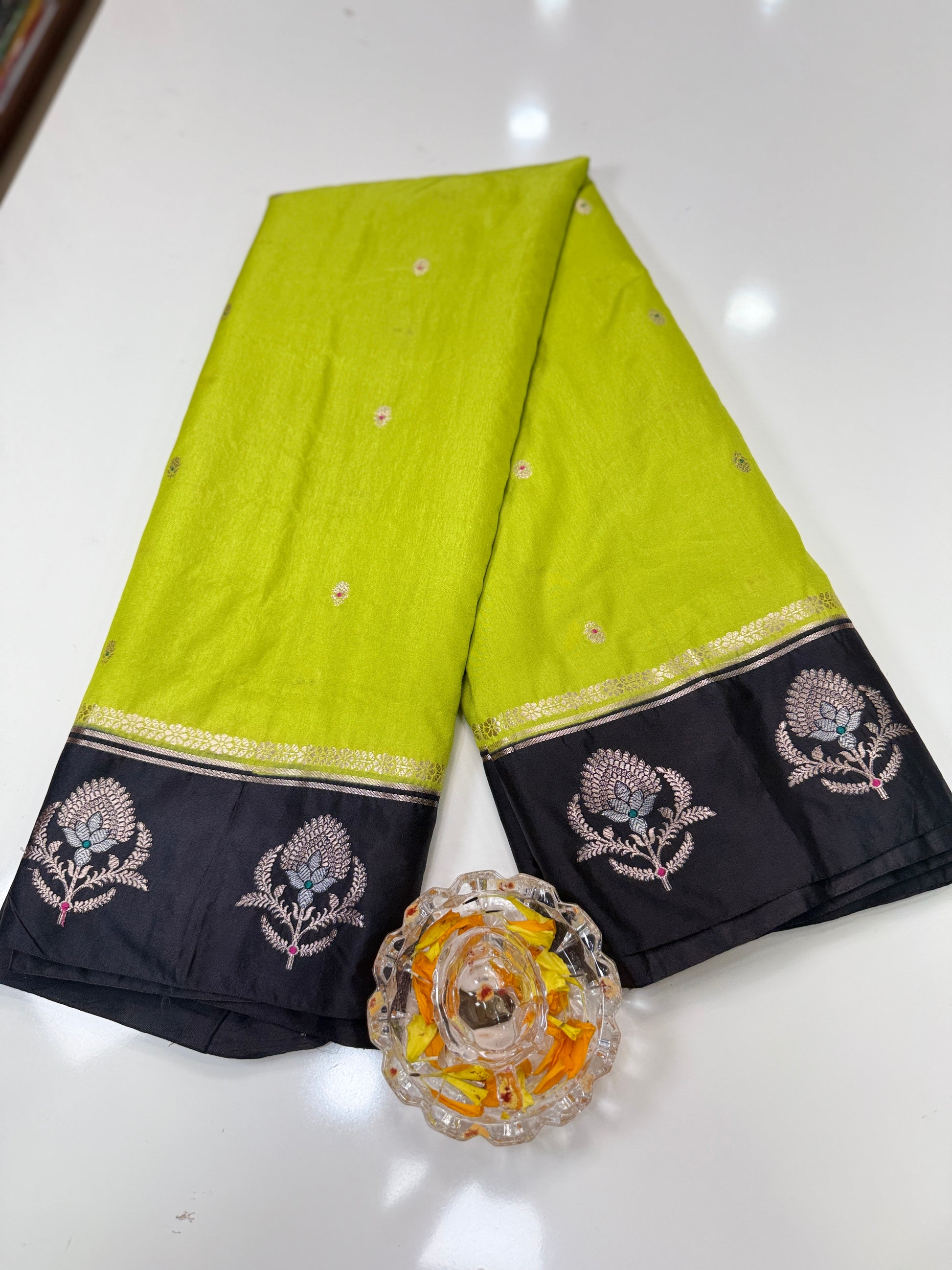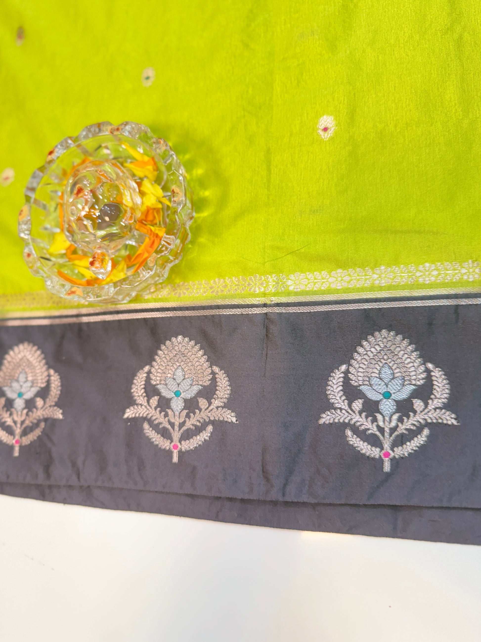 Work: Golden zari weaving with buta meenakari motifs and small buti body design