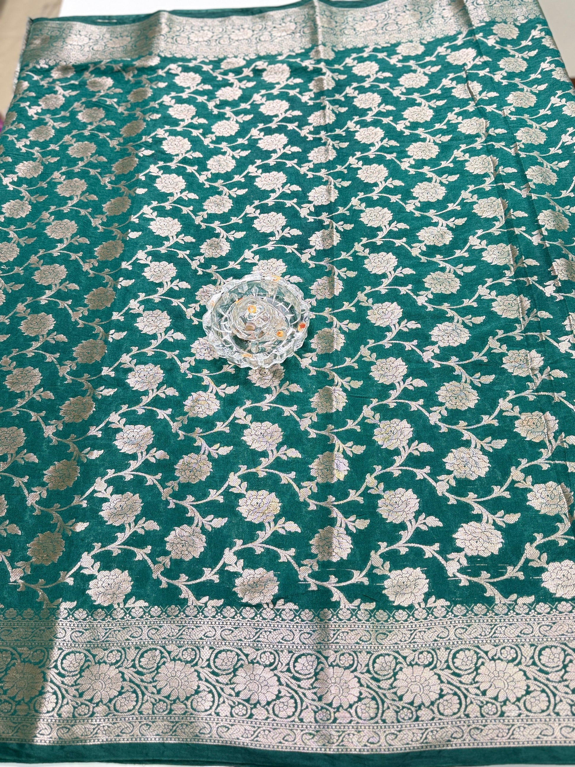This Banarasi semi dupion silk saree blends traditional weaving artistry with a refined drape, perfect for festive and wedding occasions. Crafted from semi dupion silk, the fabric has a soft sheen with a textured weave that provides both comfort and structure. The saree features all-over floral jaal weaving with zari highlights, adding richness across the body rather than limiting motifs to borders.