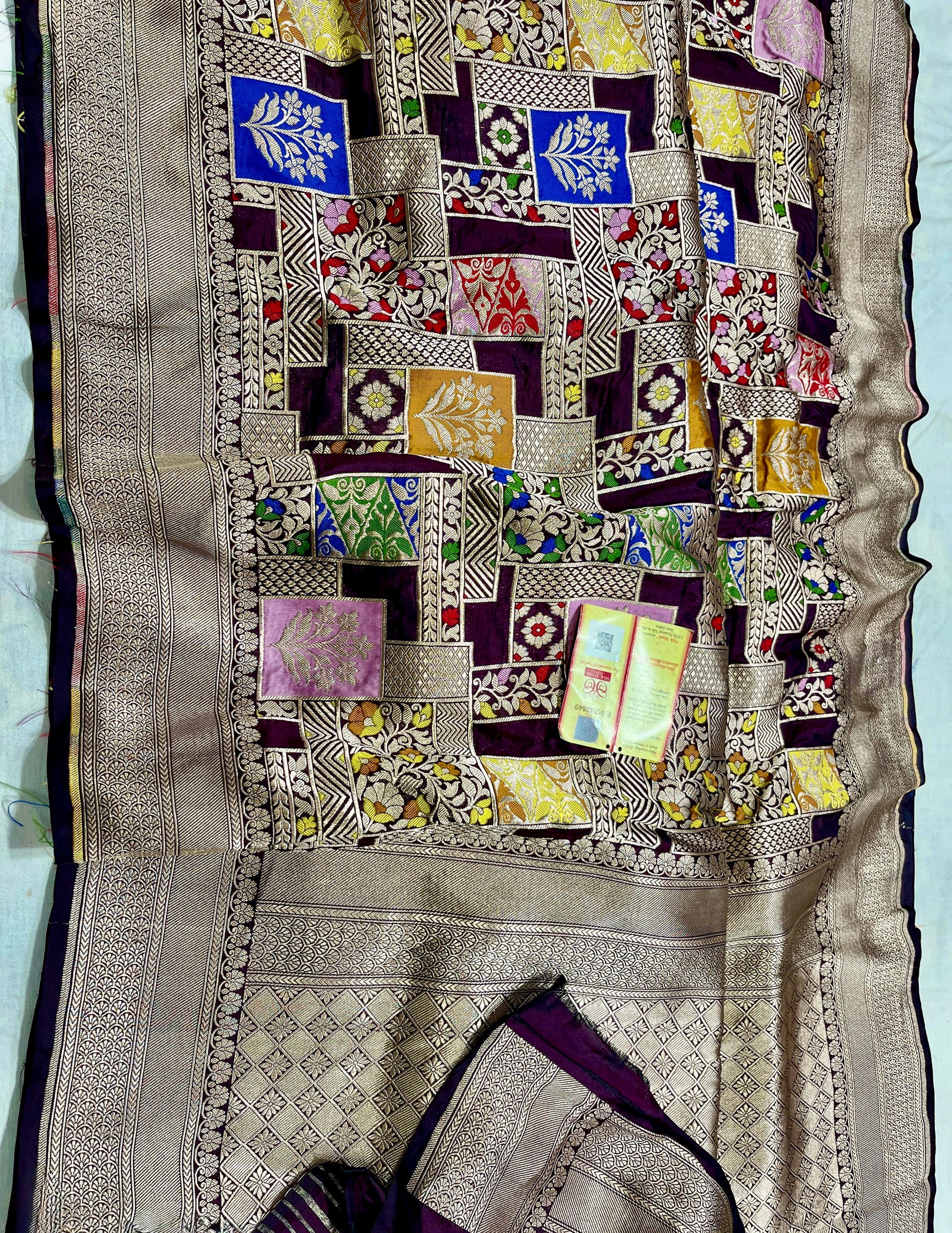 The saree features a deep base with contrasting multicolor blocks, each carrying a unique motif—from florals and vines to geometric patterns. These motifs are highlighted with fine zari work, giving the saree a luminous and regal appearance. The borders and pallu are richly decorated with traditional Banarasi patterns, making this saree suitable for weddings, receptions, and grand festive occasions.
