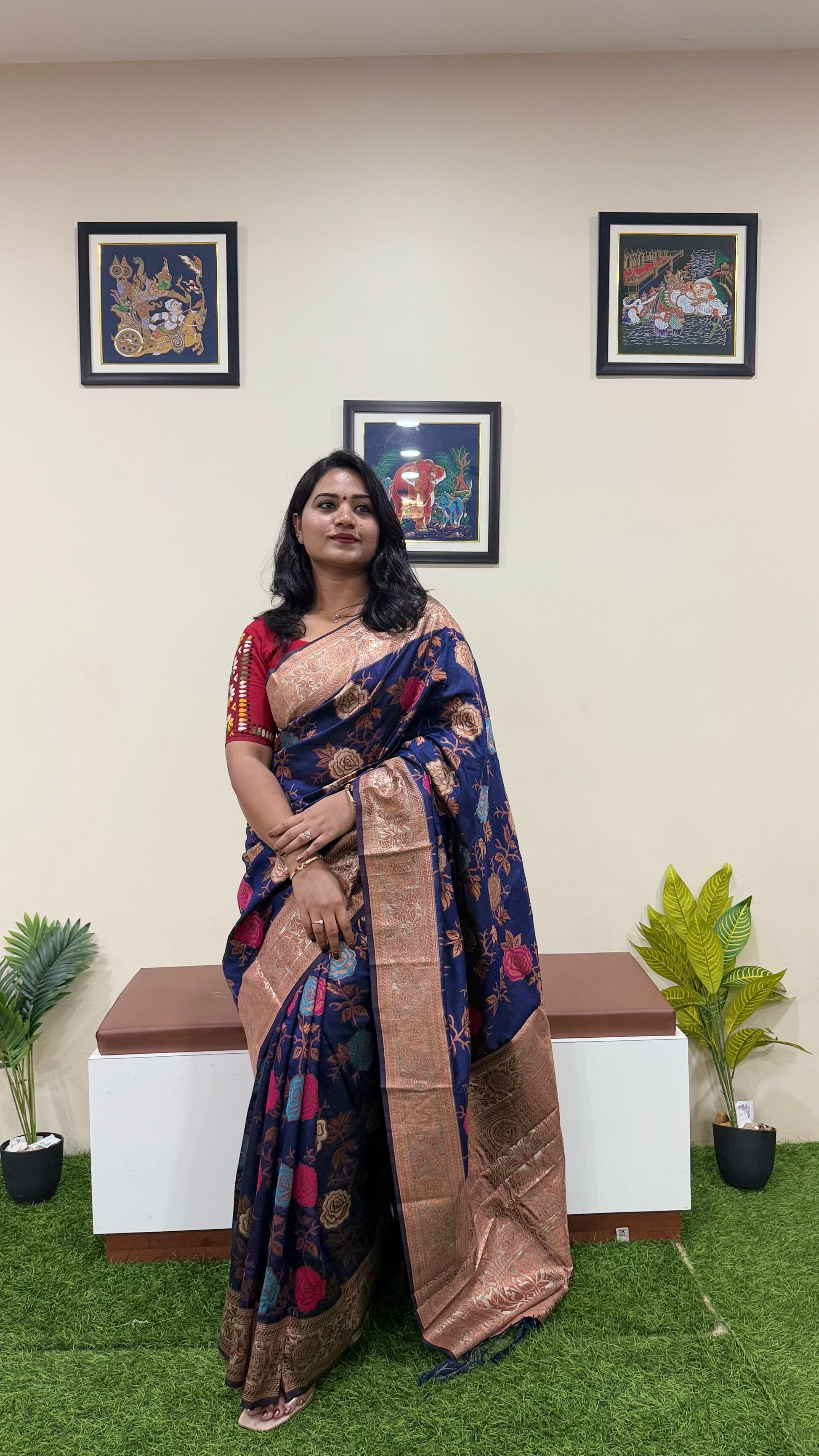Work/Design: Intricate floral woven motifs with zari highlights.