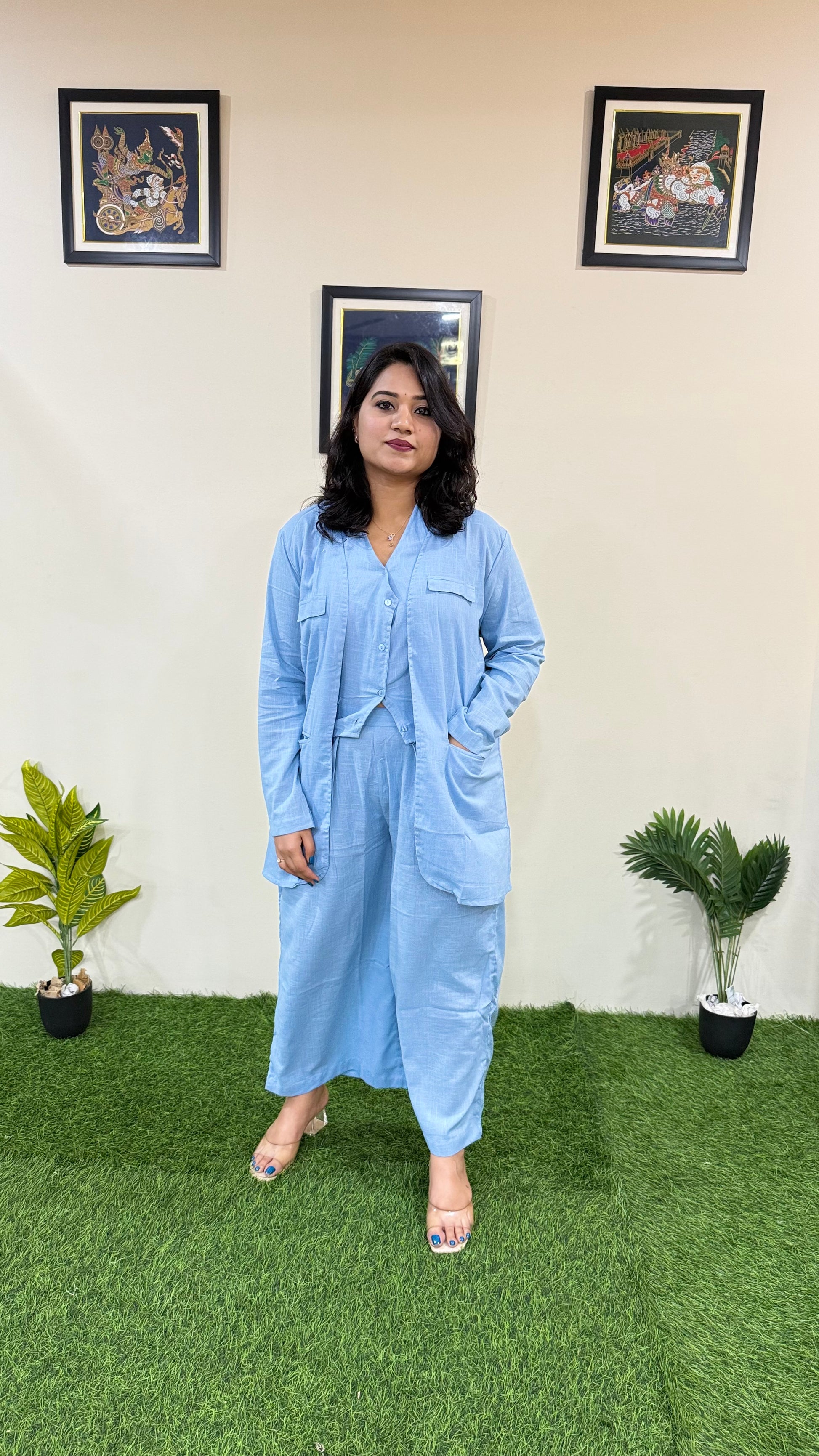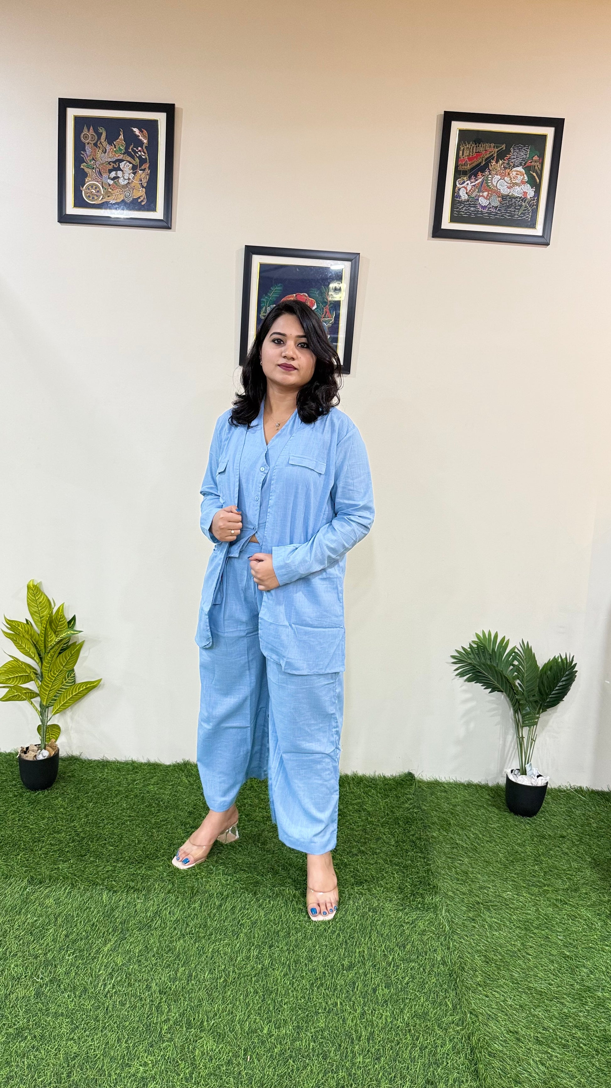 Pure Cotton Slub Bell-Bottom Pants with Halter Neck Waistcoat and Long Blazer – Women’s Three-Piece Set (Sizes 40 to 44)