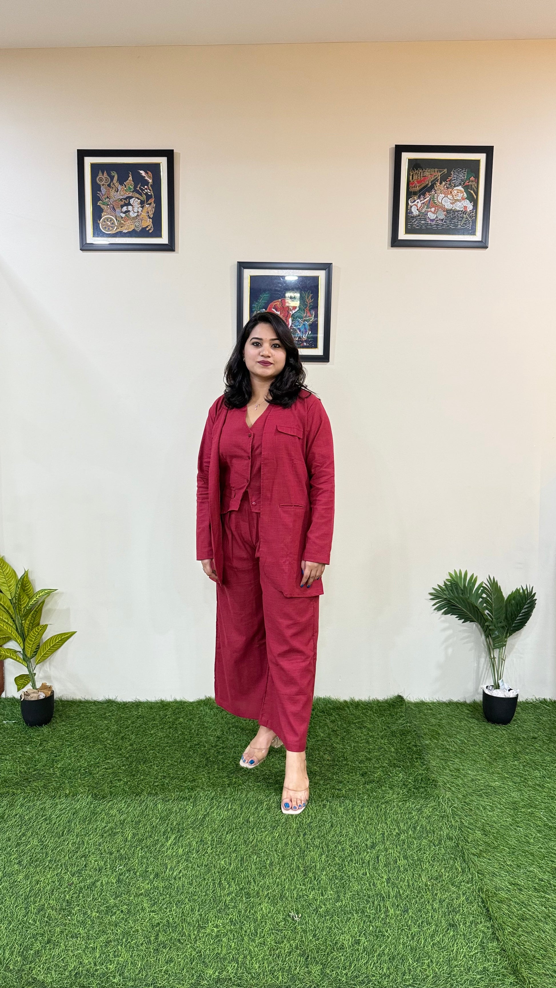 This three-piece ensemble offers a blend of retro flair and modern sophistication. Crafted from pure cotton slub, it includes bell-bottom pants with an easy fit and pockets, a halter neck waistcoat for a tailored silhouette, and a long blazer for a polished finish. The blazer measures 30” in length and can be worn layered over the waistcoat or styled separately for versatile looks. The pants feature a 37” length, offering an elegant drape and comfortable movement. Ideal for casual outings, office wear, or party occasions, this set is designed for both style and comfort.