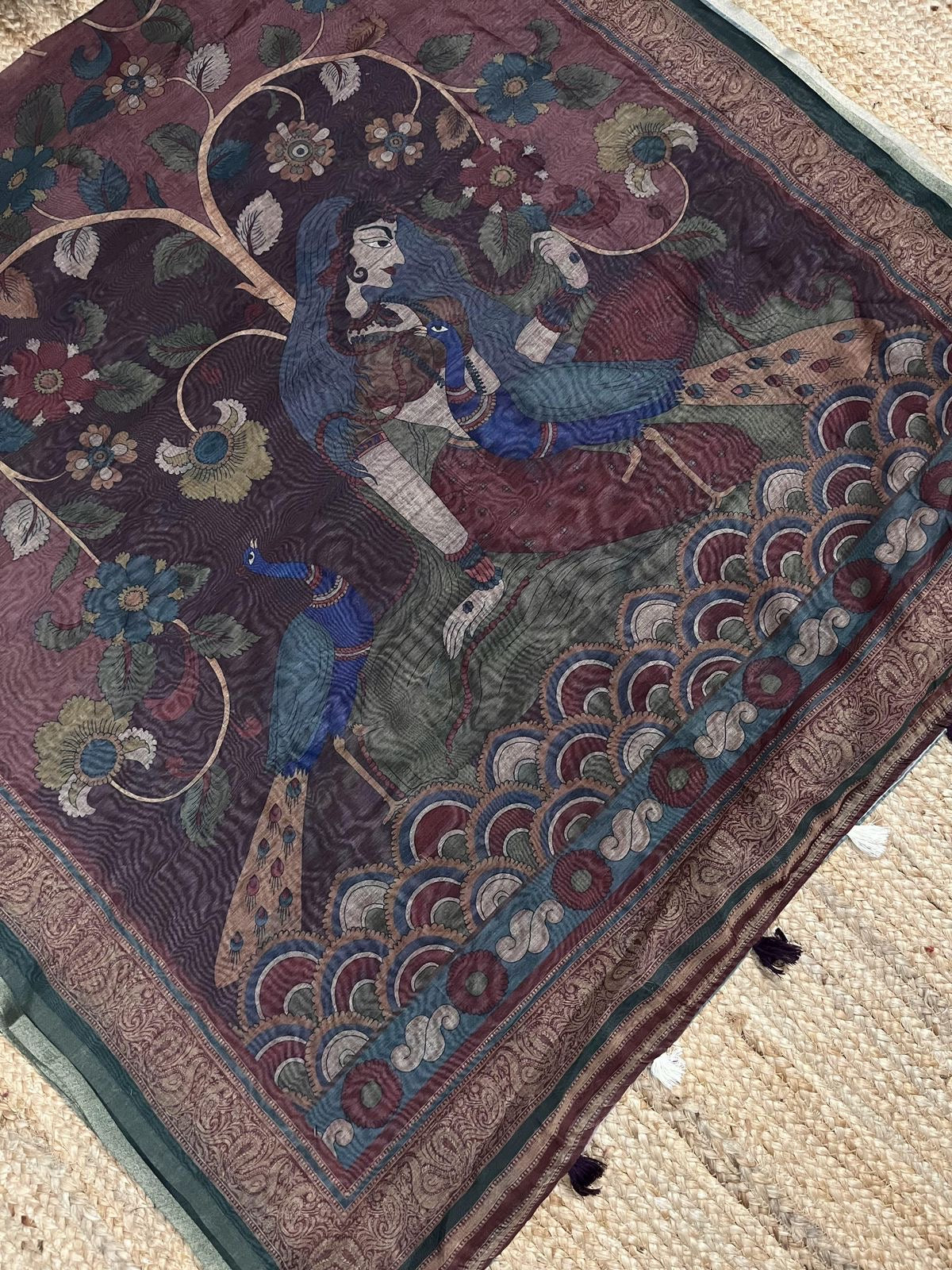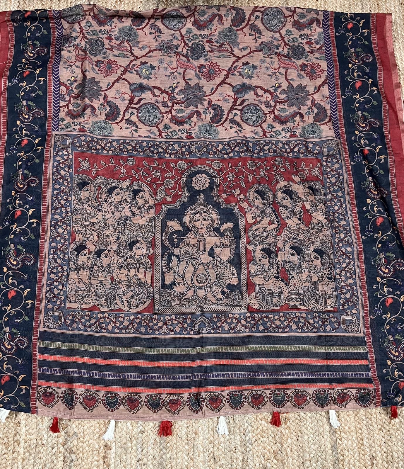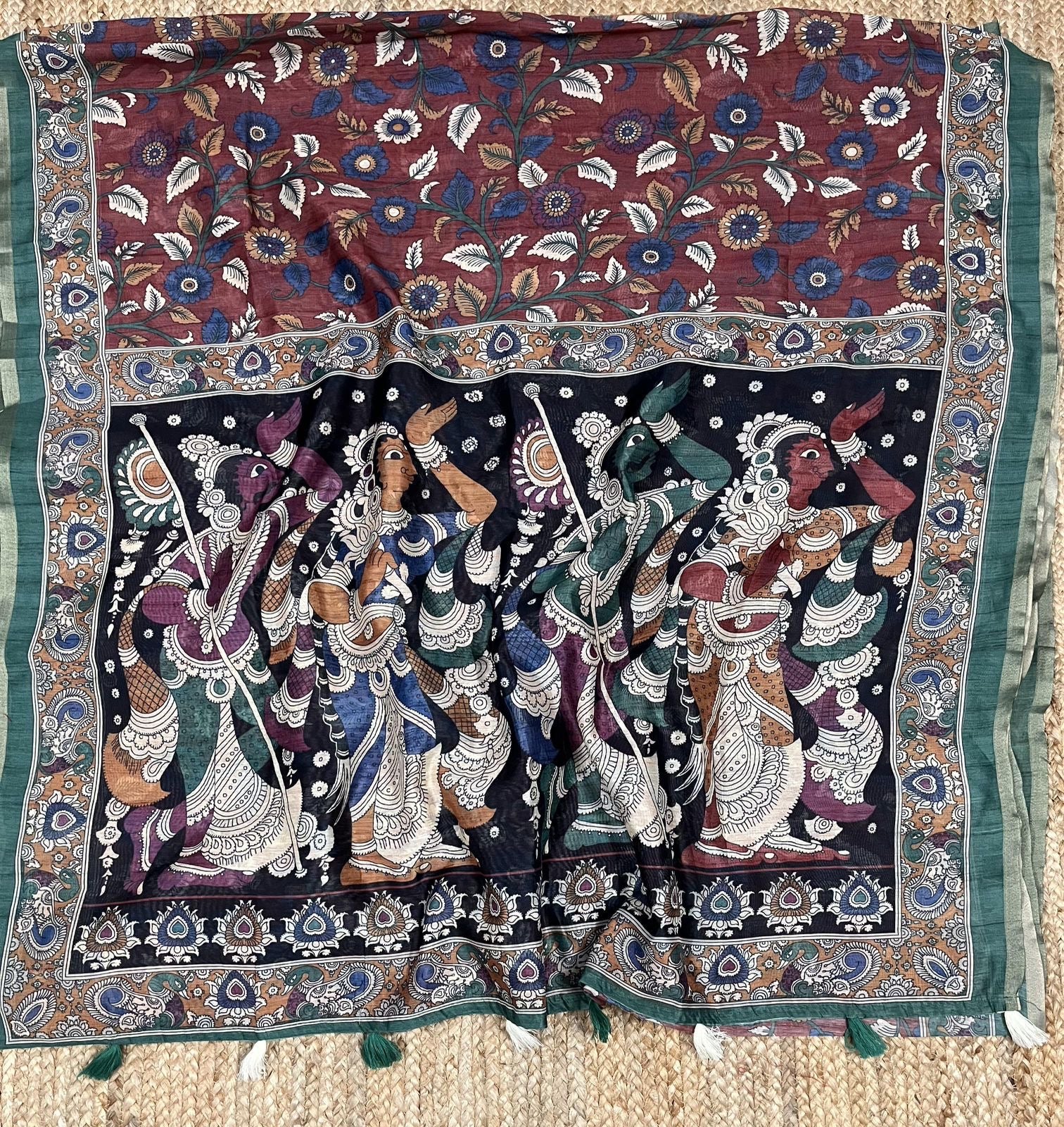 Work type: Kalamkari-inspired print with golden zari piping and latkan