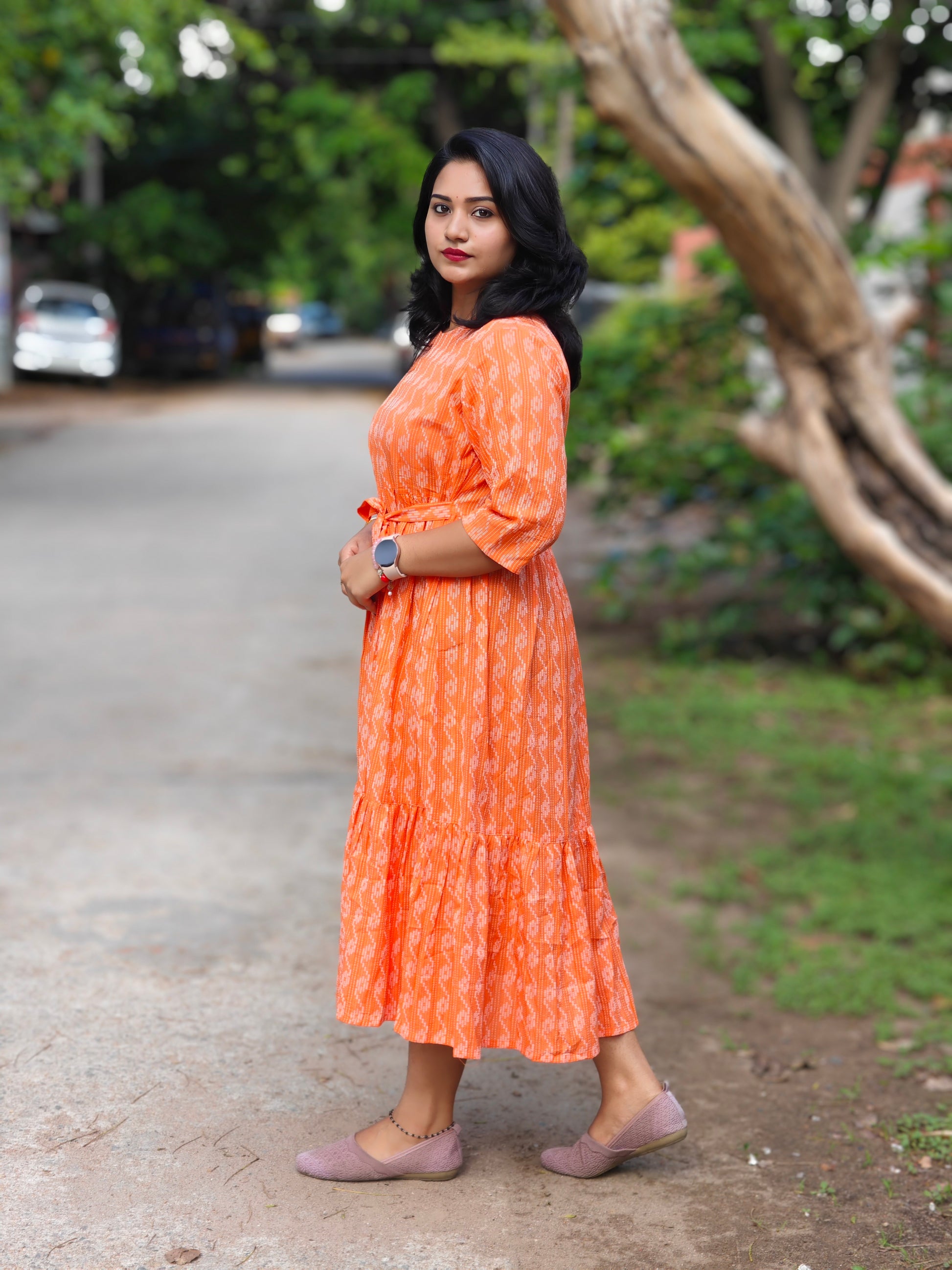 This orange cotton woven design tiered western dress is a vibrant, comfortable, and versatile outfit perfect for casual outings and daytime events. Made from breathable cotton, it features a textured woven pattern that adds depth and charm to the bright orange hue. The dress has a flattering round neckline, three-quarter sleeves, and a tiered flared hemline for a flowy silhouette. A detachable waist tie belt allows you to adjust the fit for a more defined waistline. Mid-calf length and lightweight, it’s perfect for warm-weather wear and easy to style with flats or sandals.