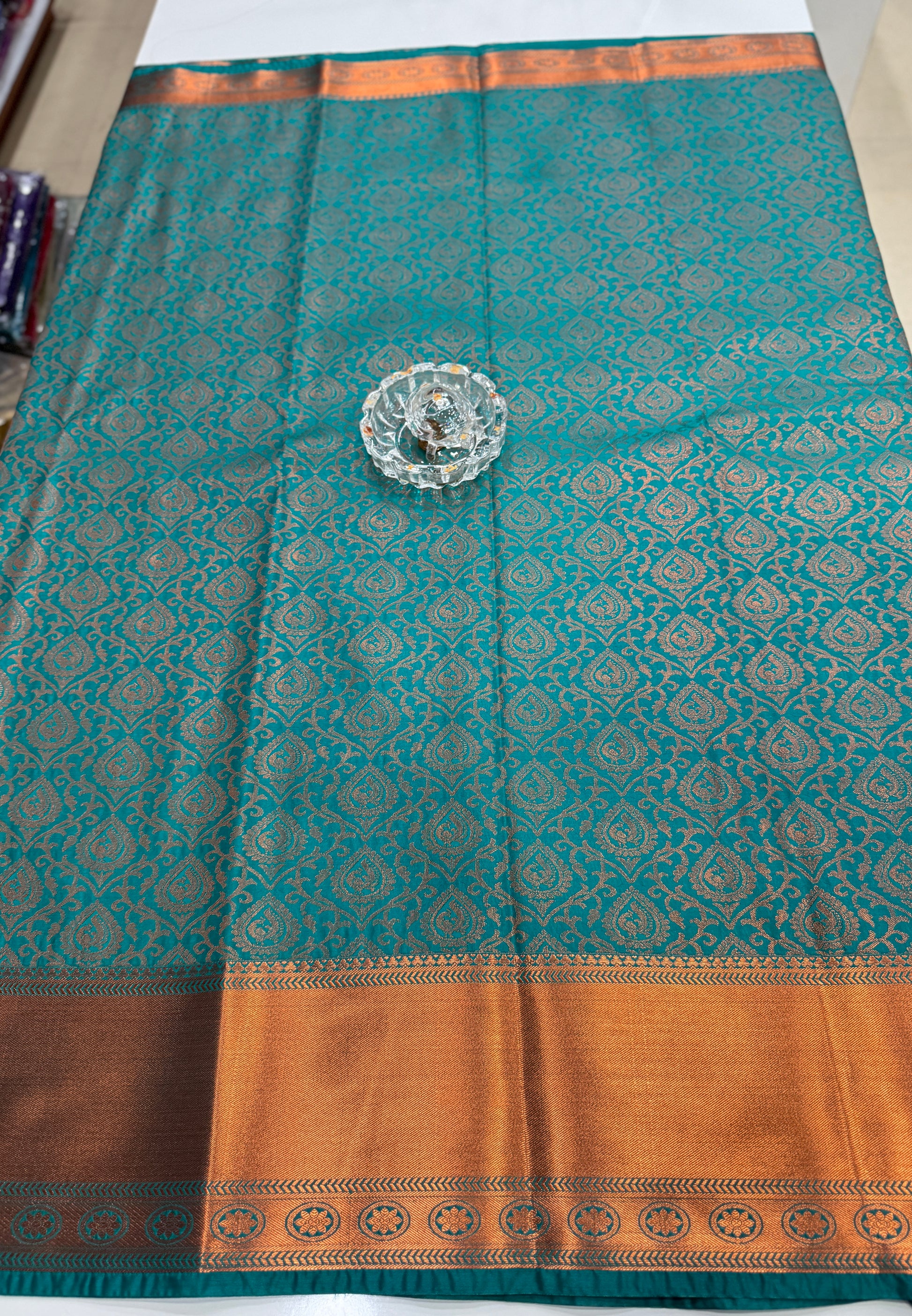 - Weaving Style: All-over jacquard motifs with contrast zari border