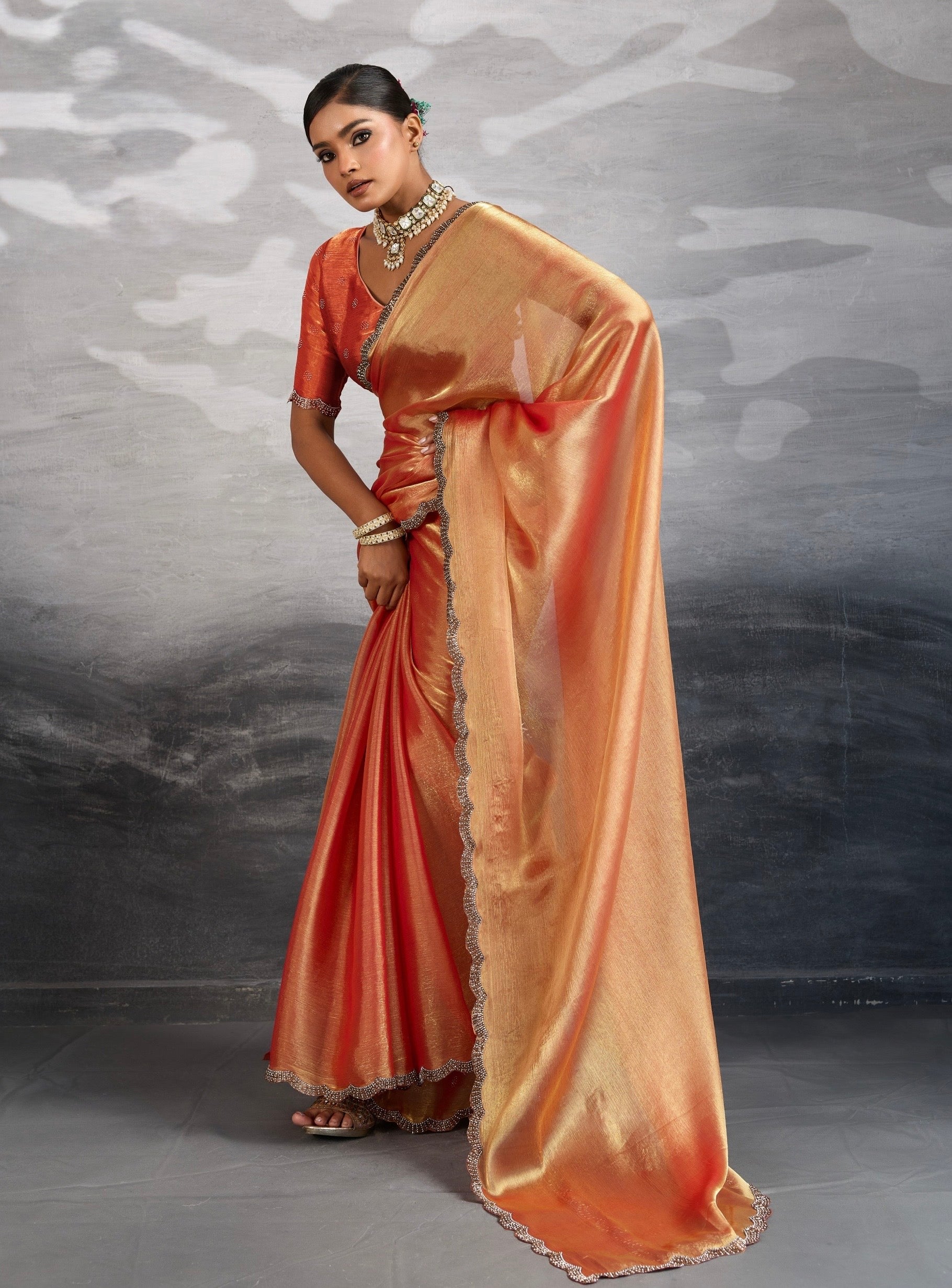 Crafted from premium Burberry chiffon, this saree flows with effortless elegance, reflecting a golden sheen that enhances its sophisticated allure. Each piece is adorned with delicate Zarkan and Cutdana appliqué lace along the border, adding subtle sparkle and texture that catch the light beautifully.