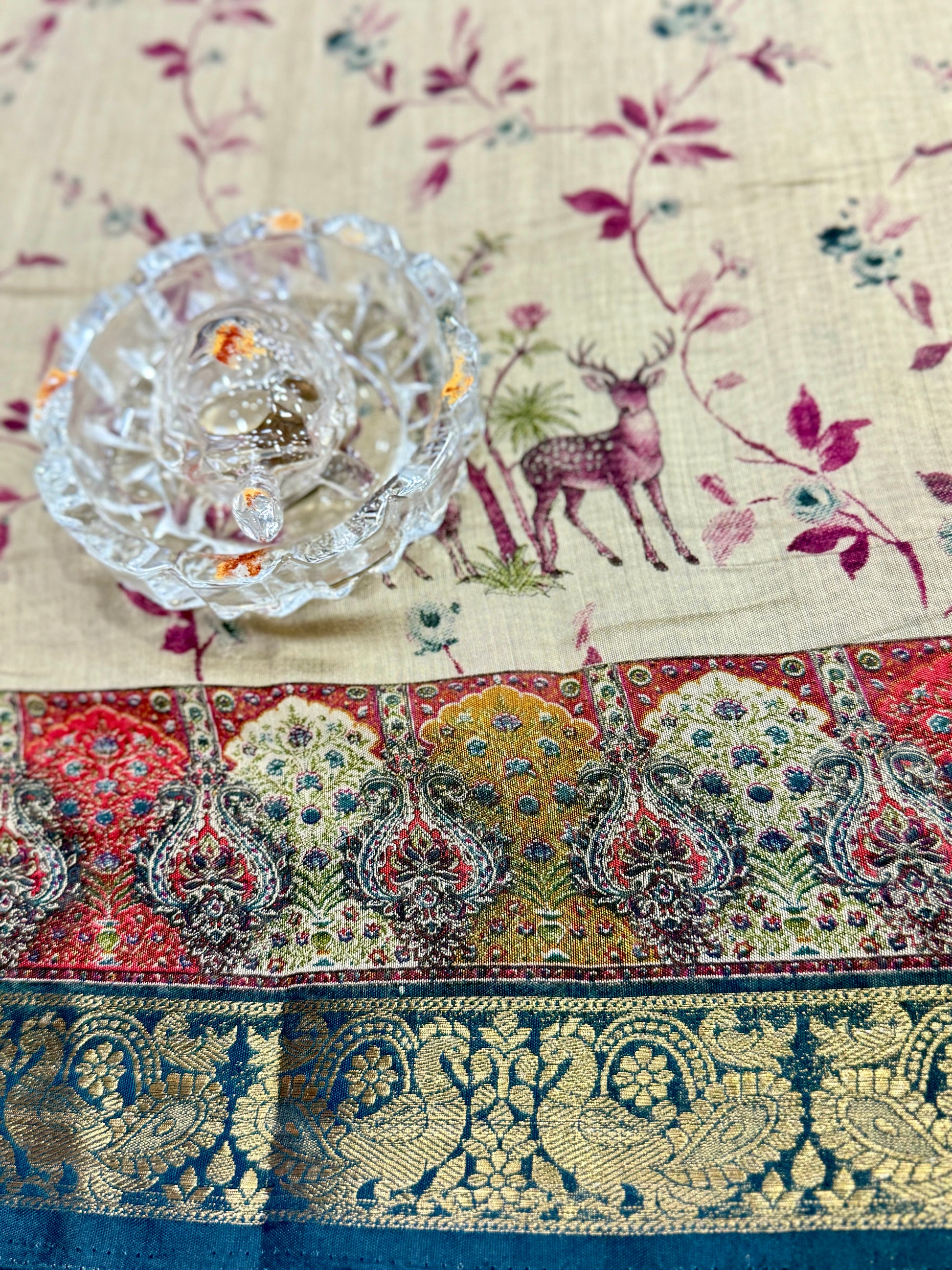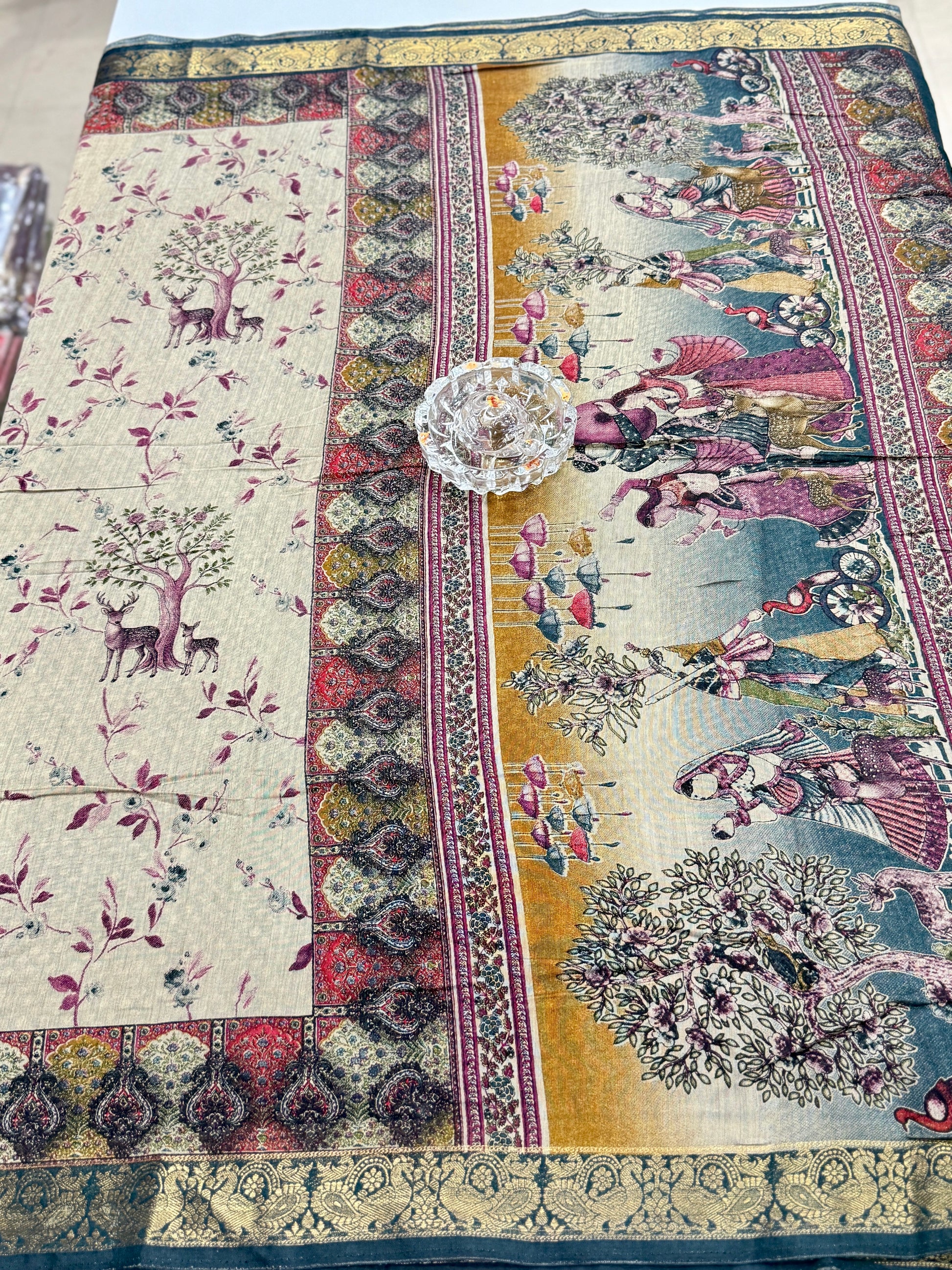 This saree is crafted in a Chennuri silk–inspired fabric known for its smooth fall, soft sheen and comfortable drape. The body features an all-over printed design with floral and deer motifs that create an elegant, heritage-inspired look. The highlight of the saree is the wide traditional artwork border, depicting royal procession elements and classic Indian miniature-style scenes that add depth and richness to the drape.