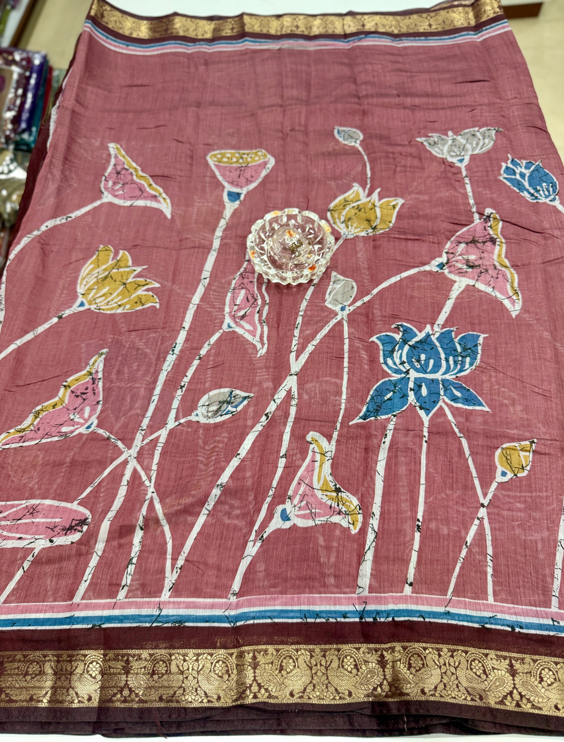 This design is available in multiple colour variations, each featuring the same artwork concept but with different borders to suit diverse style preferences. It serves as a versatile option for customers seeking a traditional look without heavy handloom weight.
