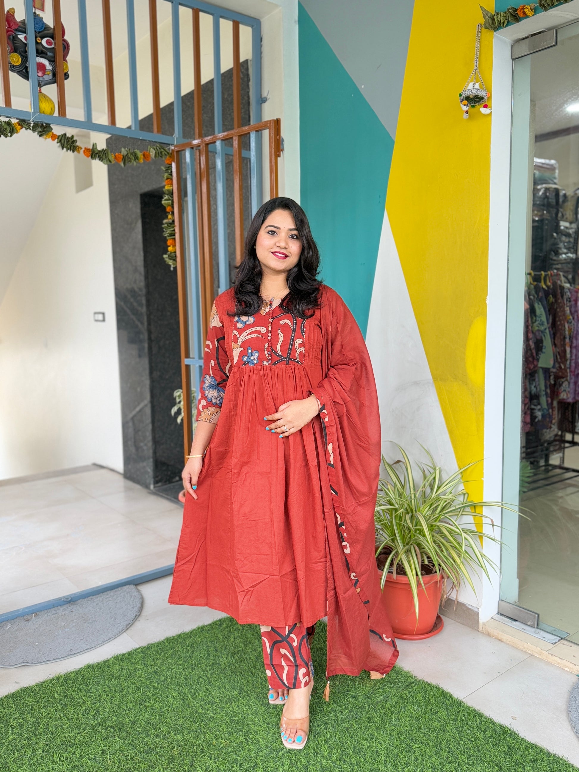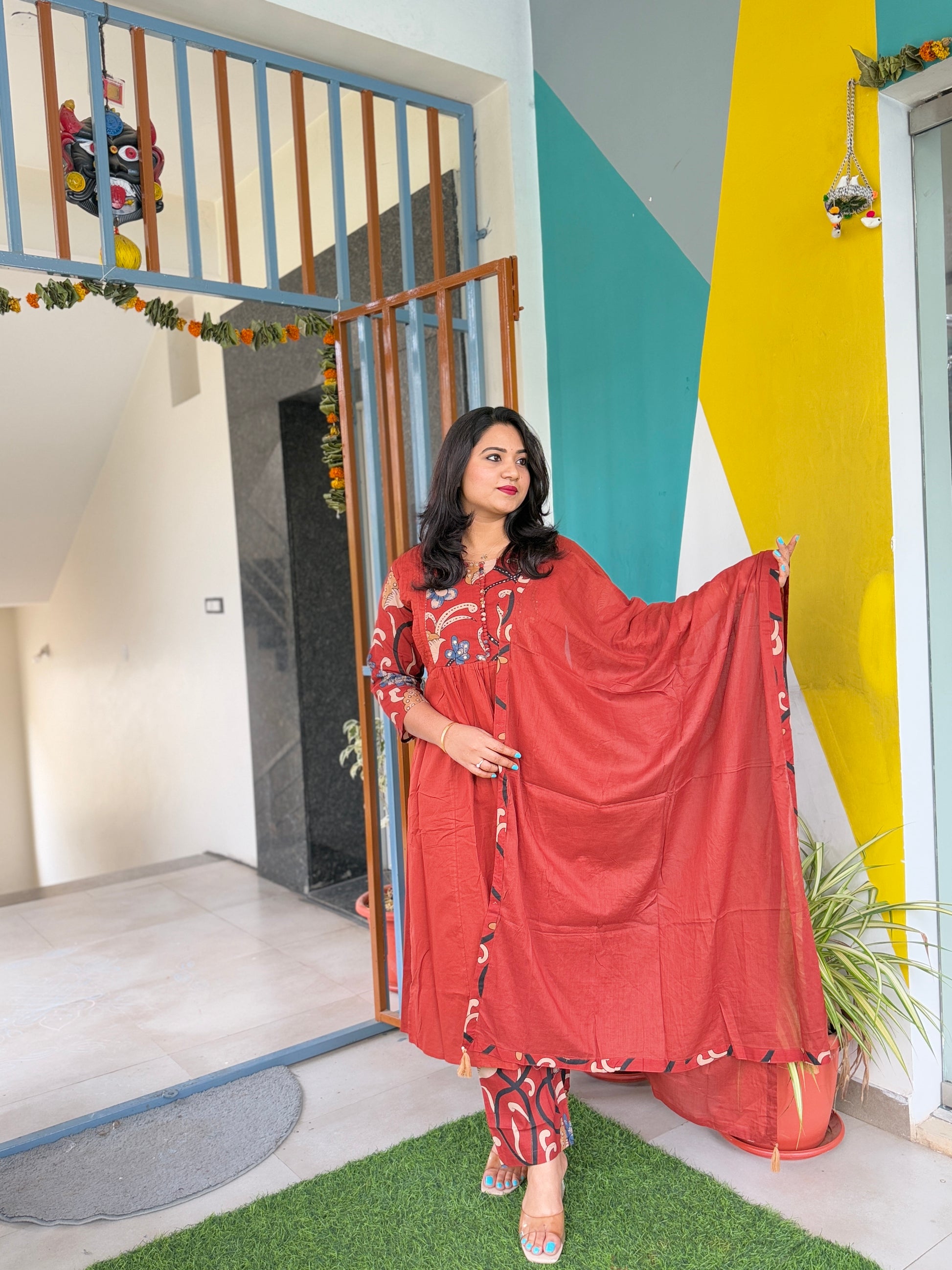 Women’s Kalamkari Cotton Kaftan Set with Embroidery and Mirror Work – Sizes 38 to 44