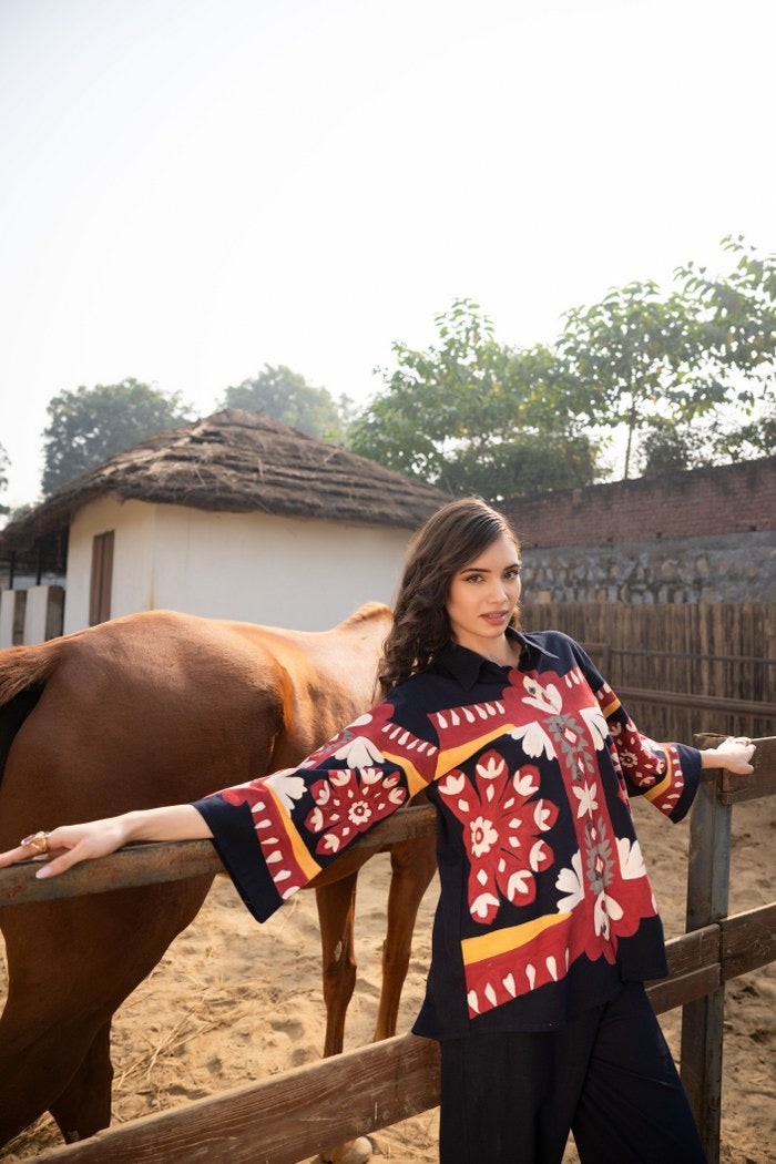 ✔ Style: Oversized Co-Ord Set (Top + Bottom)Cotton Poplin Oversized Co-Ord Set with Hand Brush Painted Design – Artistic Casual Wear for Women (Sizes 38 to 44)