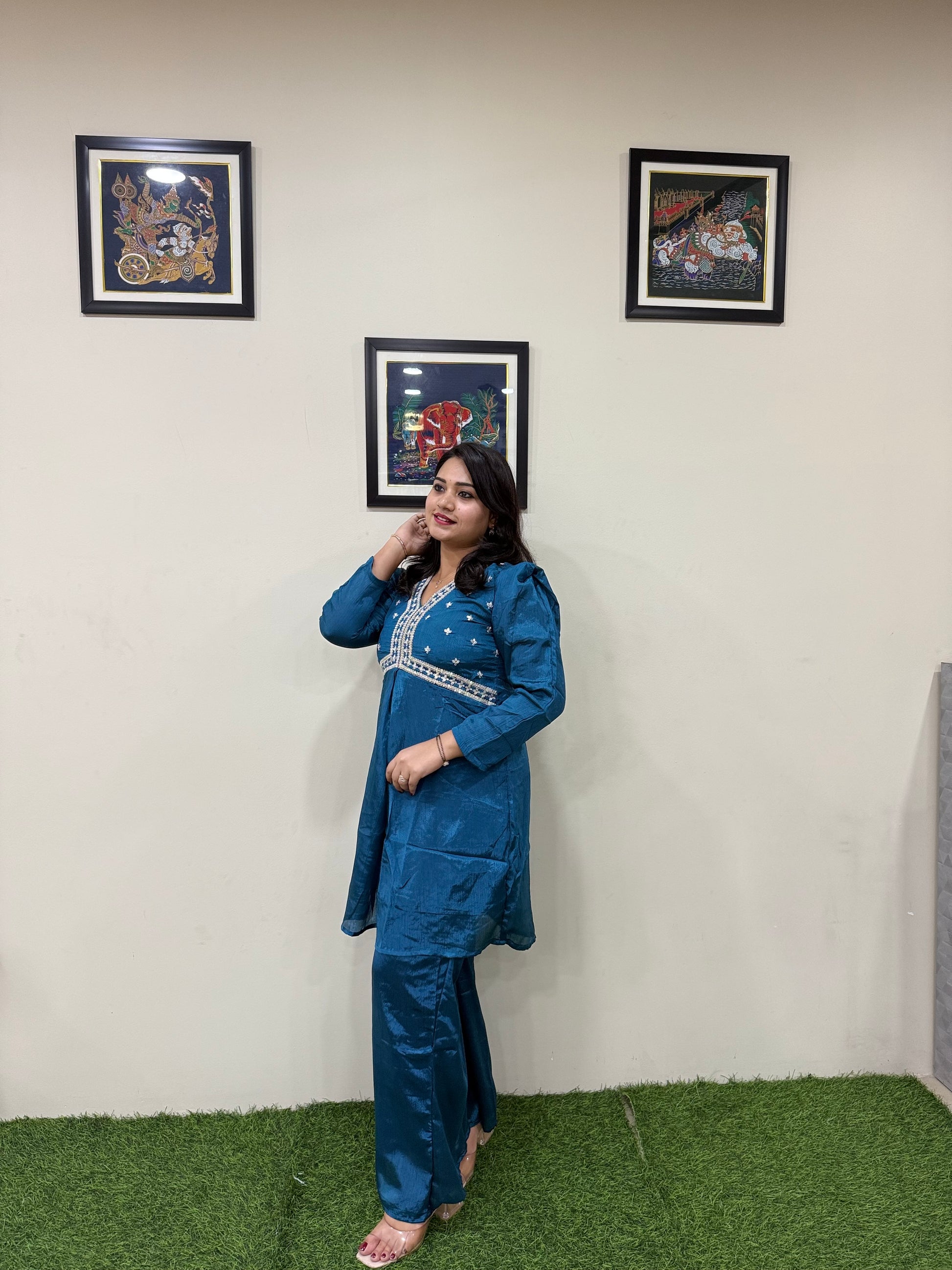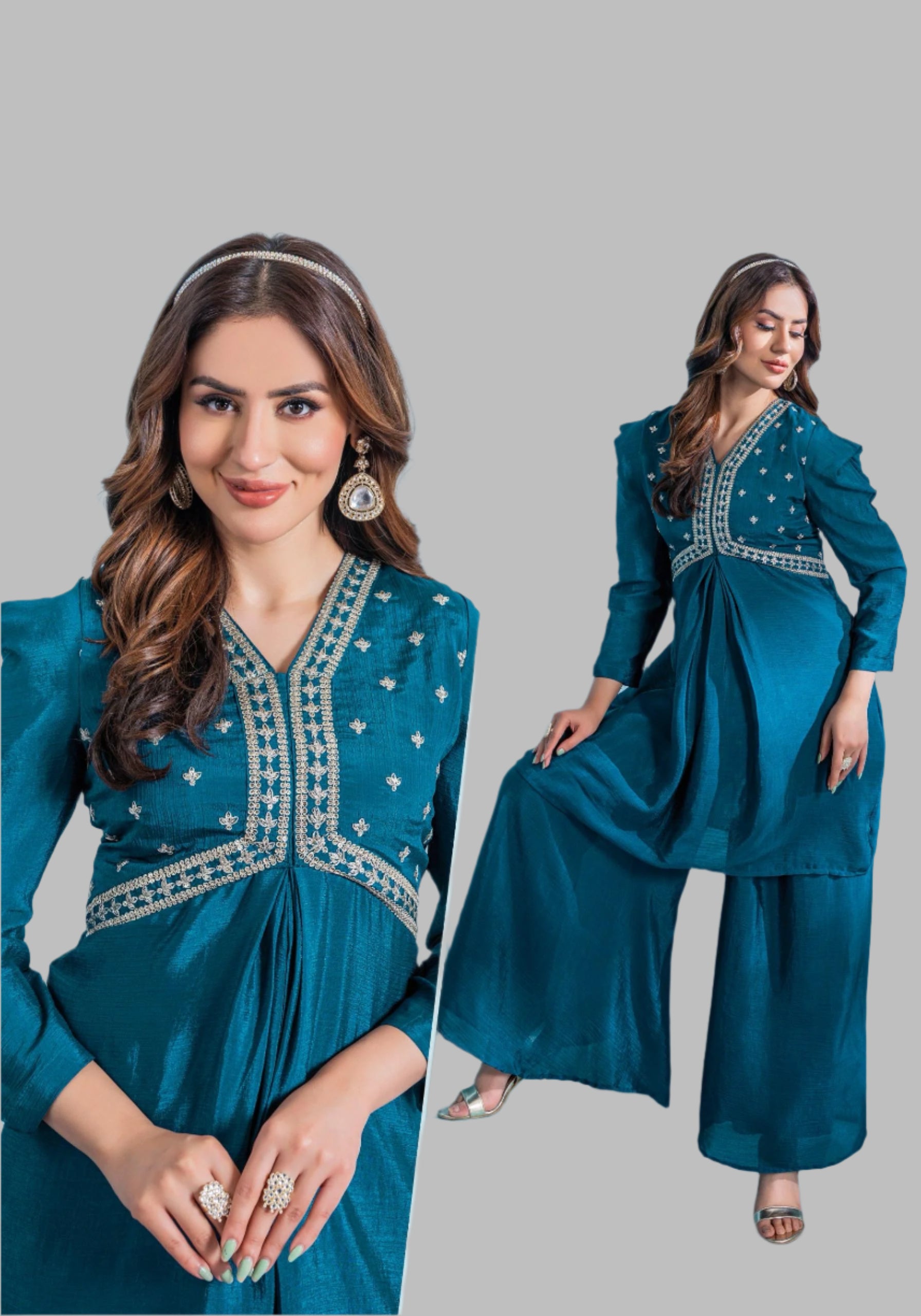 Available in sizes M, L, XL, and 2XL, this fully stitched co-ord set provides a flattering regular fit that accommodates various body types. The collection features seven exclusive design variants, each styled to reflect elegant yet wearable glamour, focusing on draped silhouettes, subtle tailoring, and clean lines.