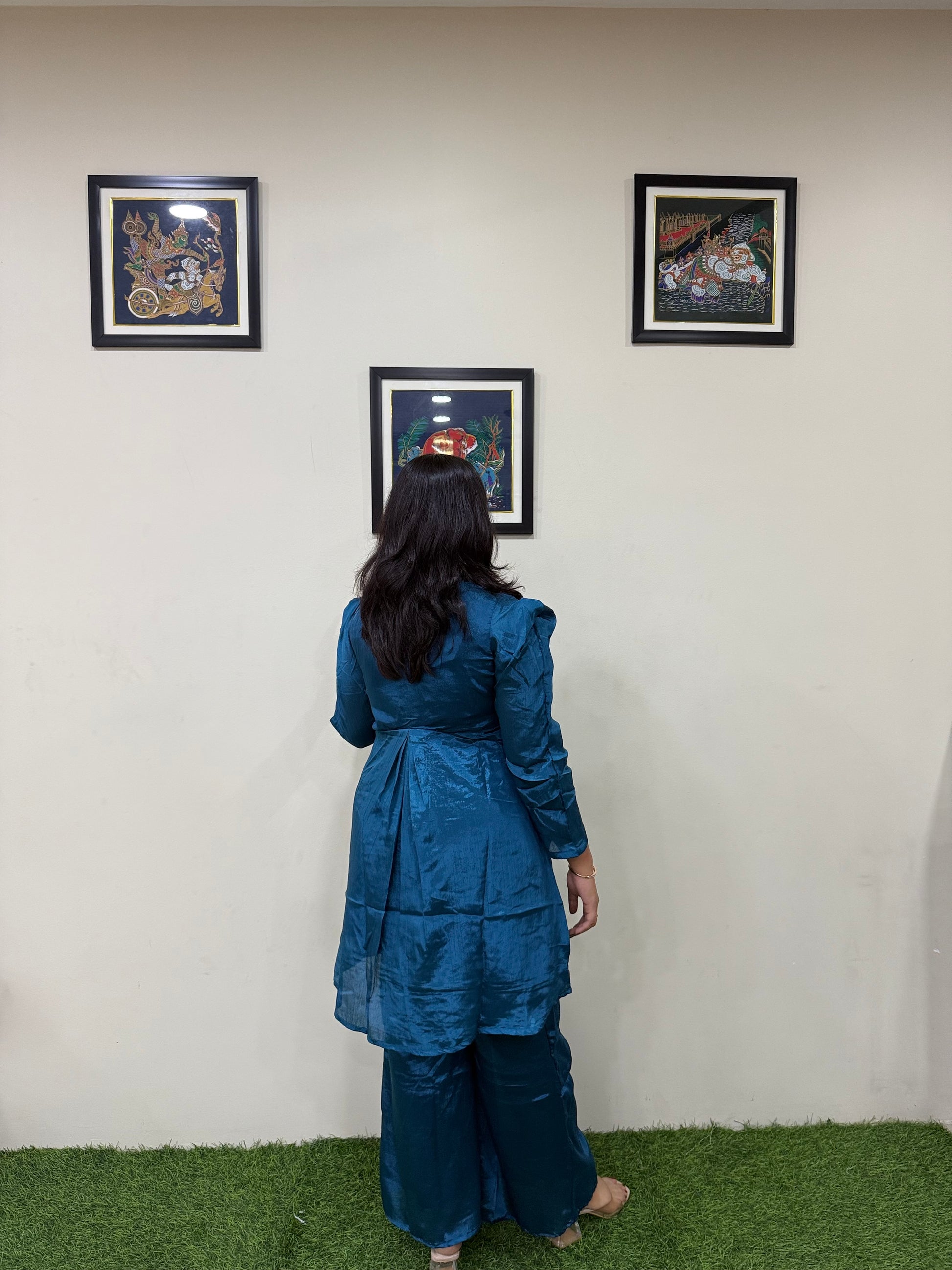 Perfect for those seeking graceful and contemporary Indian festive attire, this chinnon co-ord set offers versatility in wear — dress it up with heels and statement earrings for weddings or wear it with light accessories for less formal celebrations. It serves as an excellent choice for women seeking a stylish alternative to traditional ethnic sets while maintaining cultural charm.