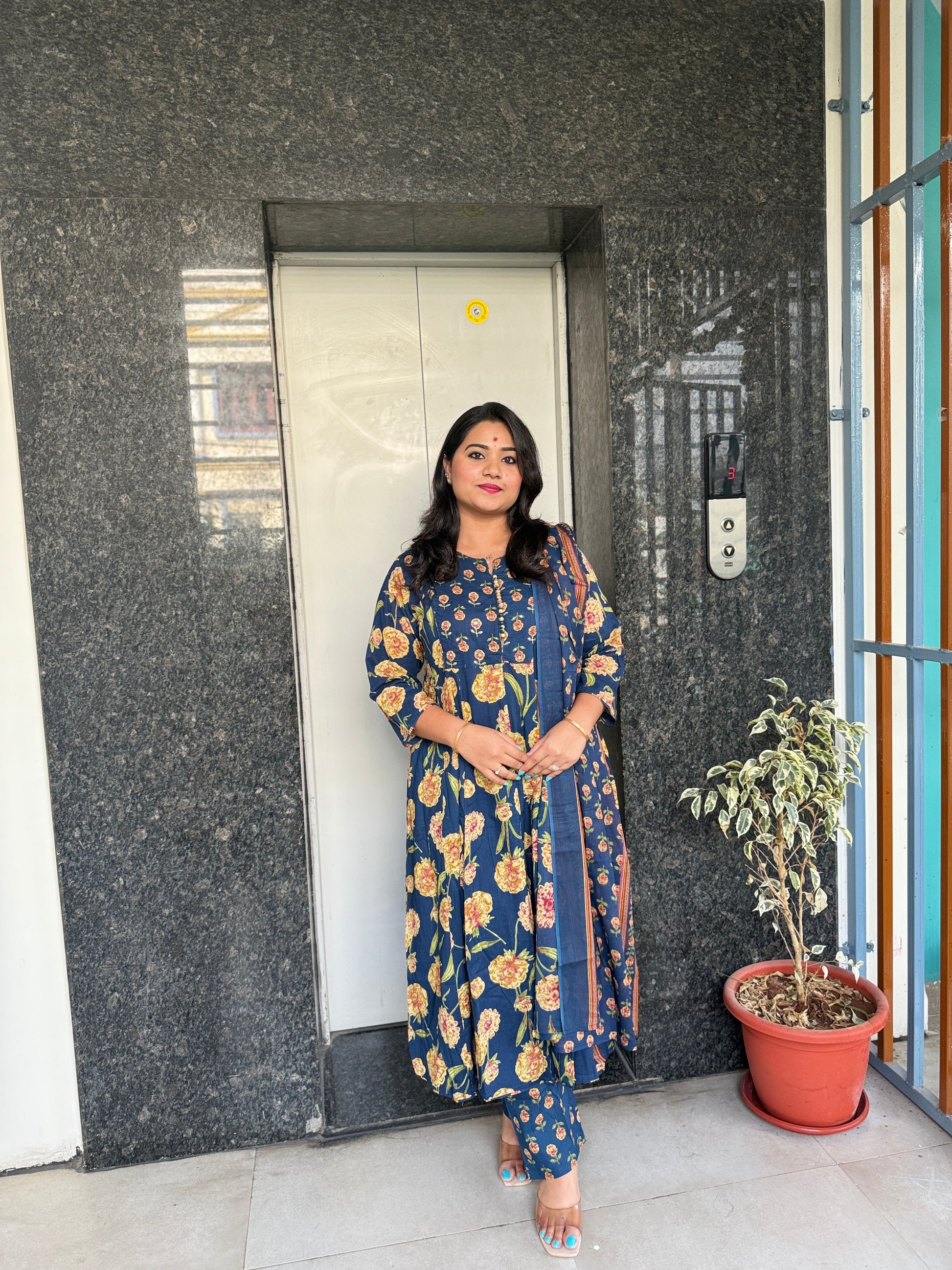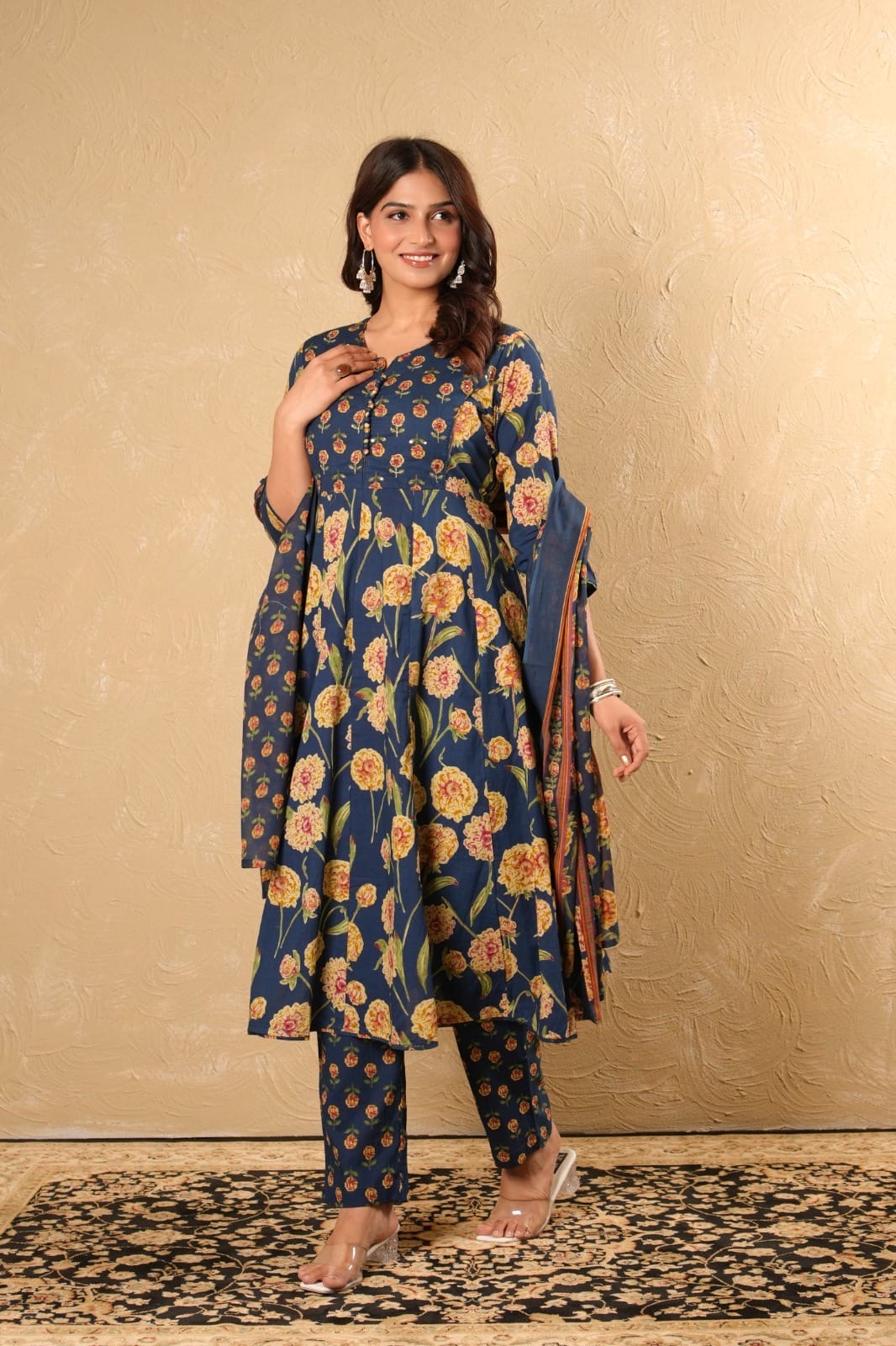 Cotton Anarkali Kurta Pant Dupatta Set with Detailing Work – M to 3XL