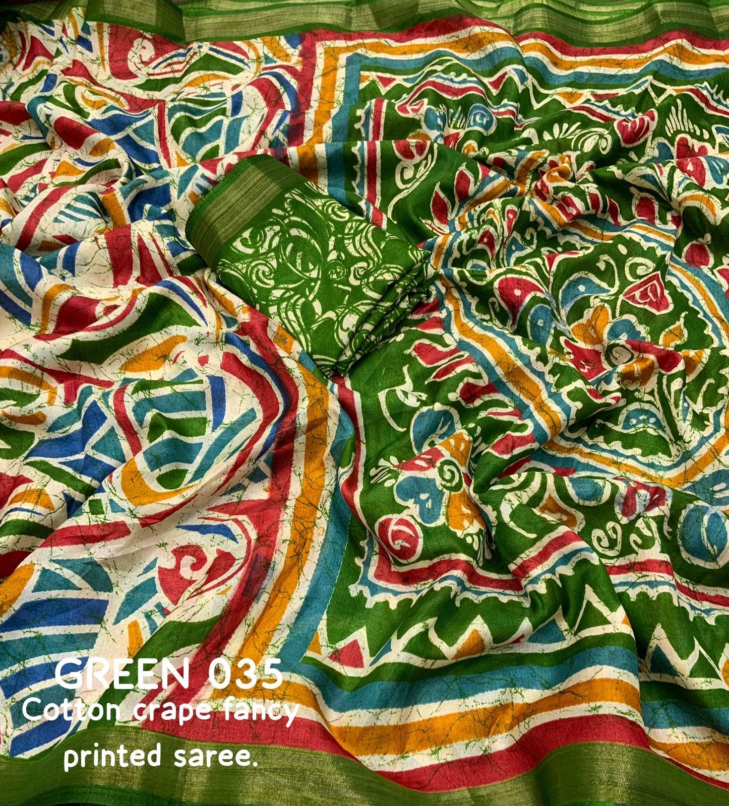 Cotton Crape Saree with Multicolor Fancy Print and Running Blouse – Lightweight Daily & Festive Wear