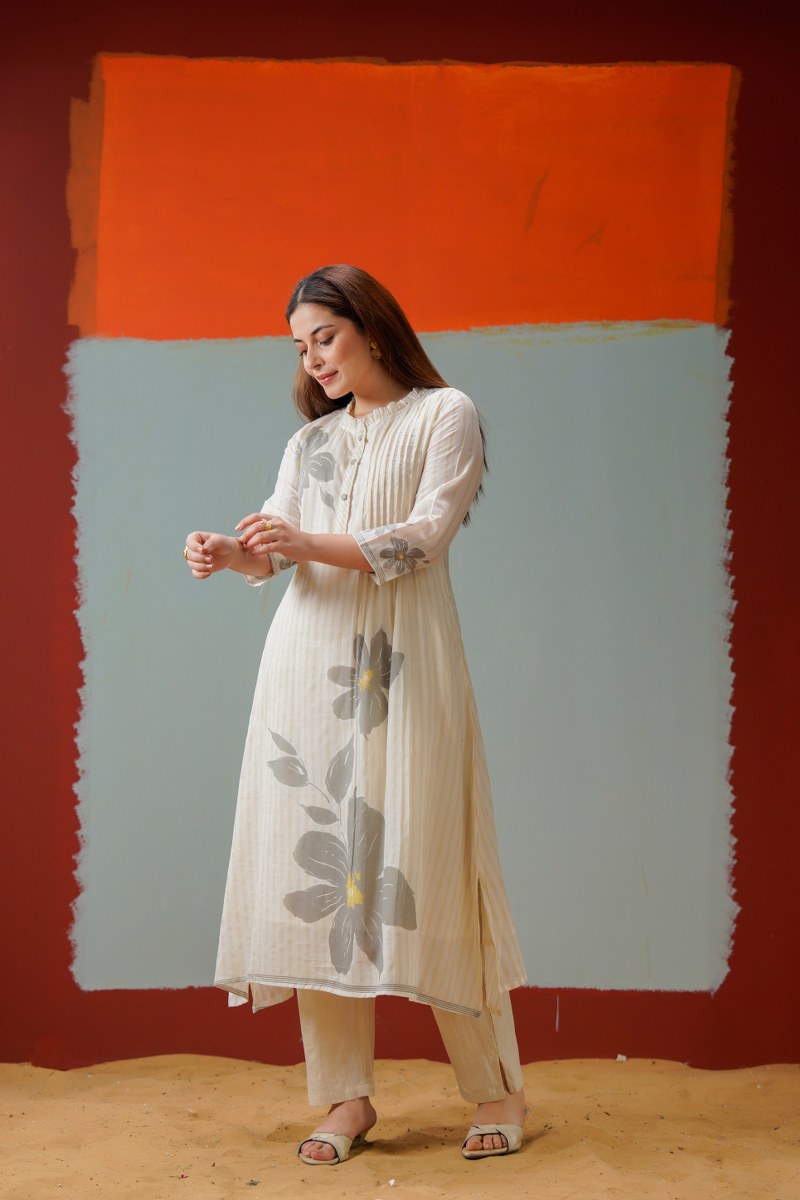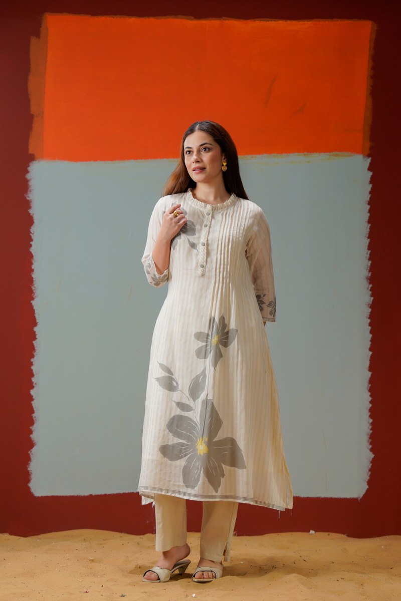 Cotton Kurti Pant Set for Women, Floral Printed Kurta with Pintuck Front, M to XXL
