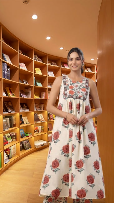 This cream cotton kurta set brings effortless charm to everyday wear with its gathered flare silhouette and bold floral print. Featuring a printed yoke and a sleeveless design, the kurta flows gracefully from the chest, offering all-day comfort. Paired with matching printed cotton pants, this fully stitched set is ideal for summer casuals, brunch outings, or weekend ethnic chic looks.