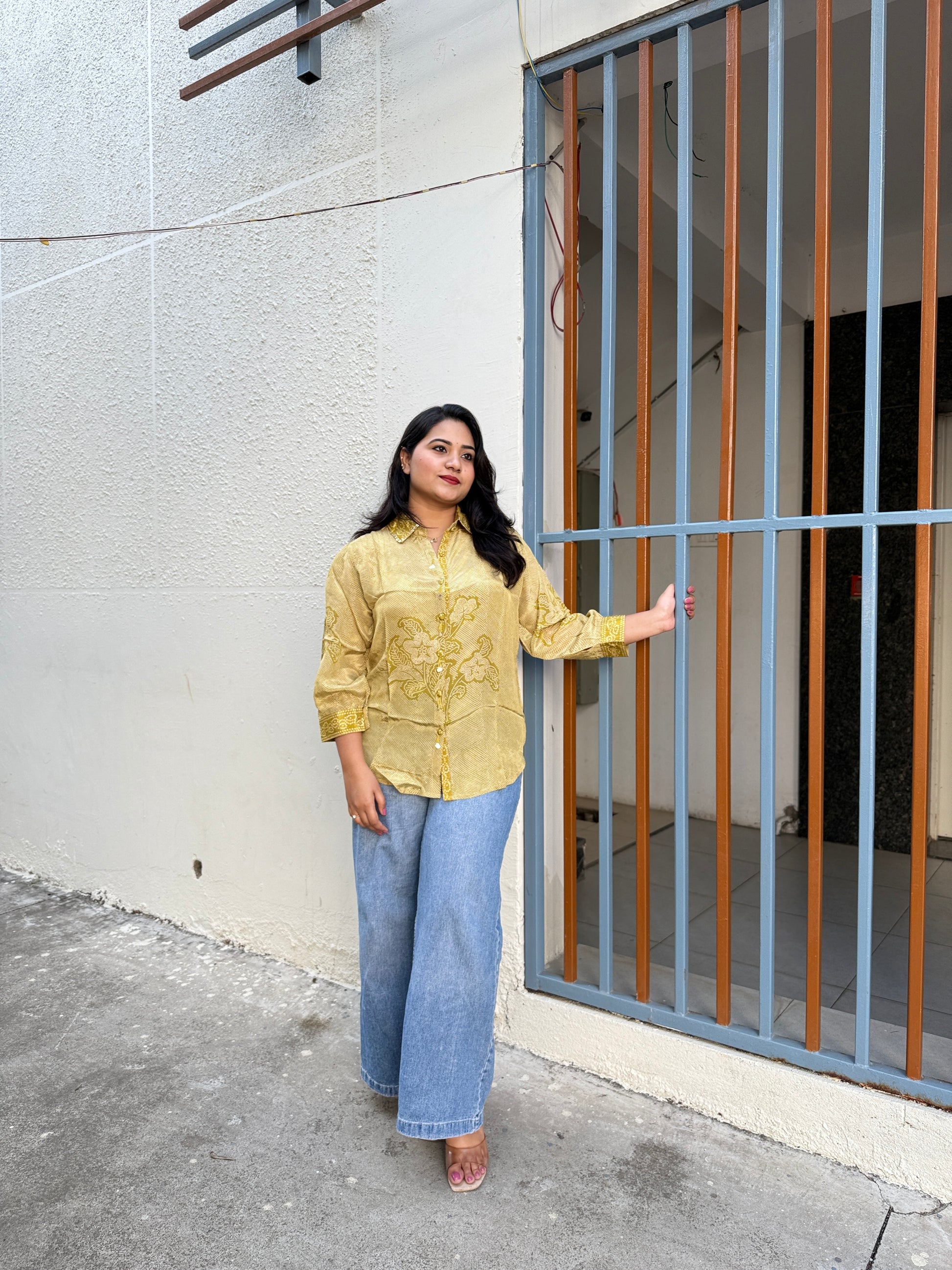 The collared neckline and three-quarter sleeves add a refined touch, making it suitable for office wear, festive gatherings, and casual outings. Available in two vibrant shades, the top pairs seamlessly with trousers, denims, or skirts for a fusion-ready look. The relaxed fit caters to sizes 38 to 44, offering both comfort and style without compromising on detailing.