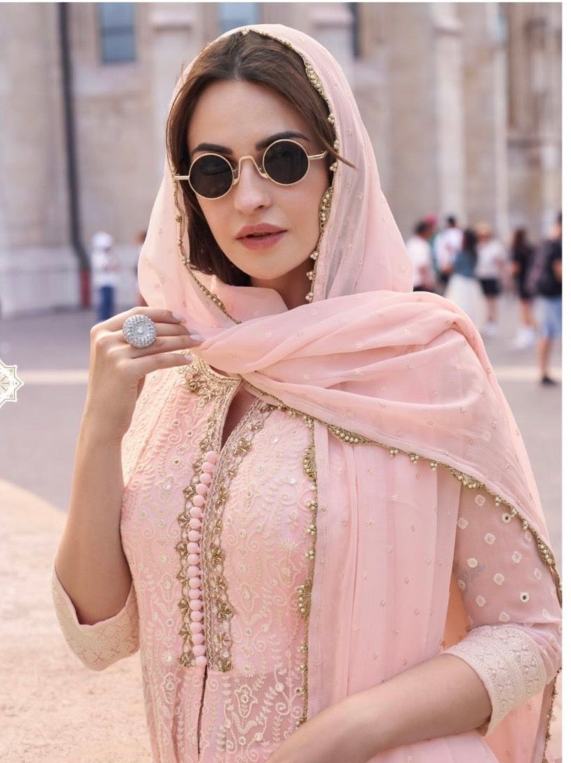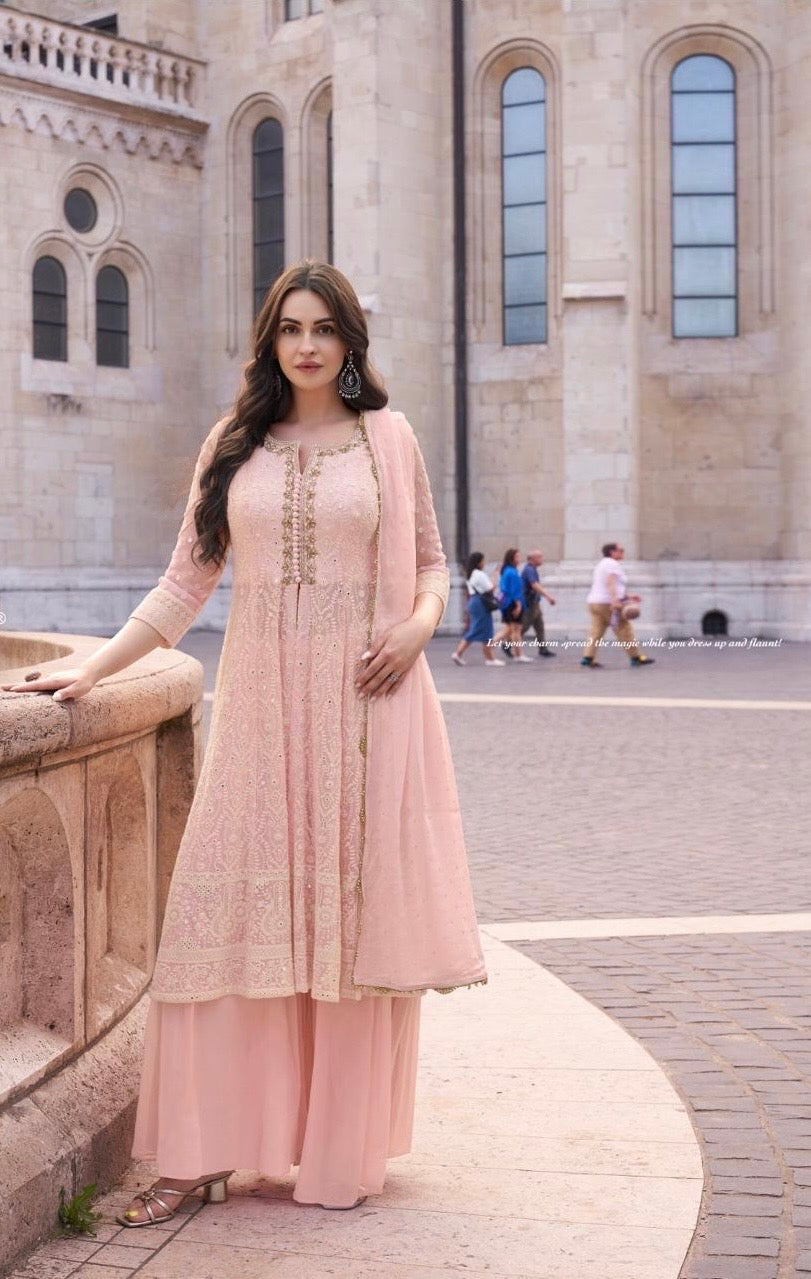 The Afsana collection is an elegant 3-piece ethnic set crafted from luxurious real georgette fabric. Designed for festive occasions and special events, this ensemble includes a fully stitched free-size top adorned with detailed embroidery, a coordinated georgette palazzo, and a beautifully embroidered georgette dupatta. The soft, breathable texture of real georgette provides a graceful drape and ensures all-day comfort. With its timeless silhouette and flowing fit, this outfit is ideal for weddings, receptions, and traditional gatherings.