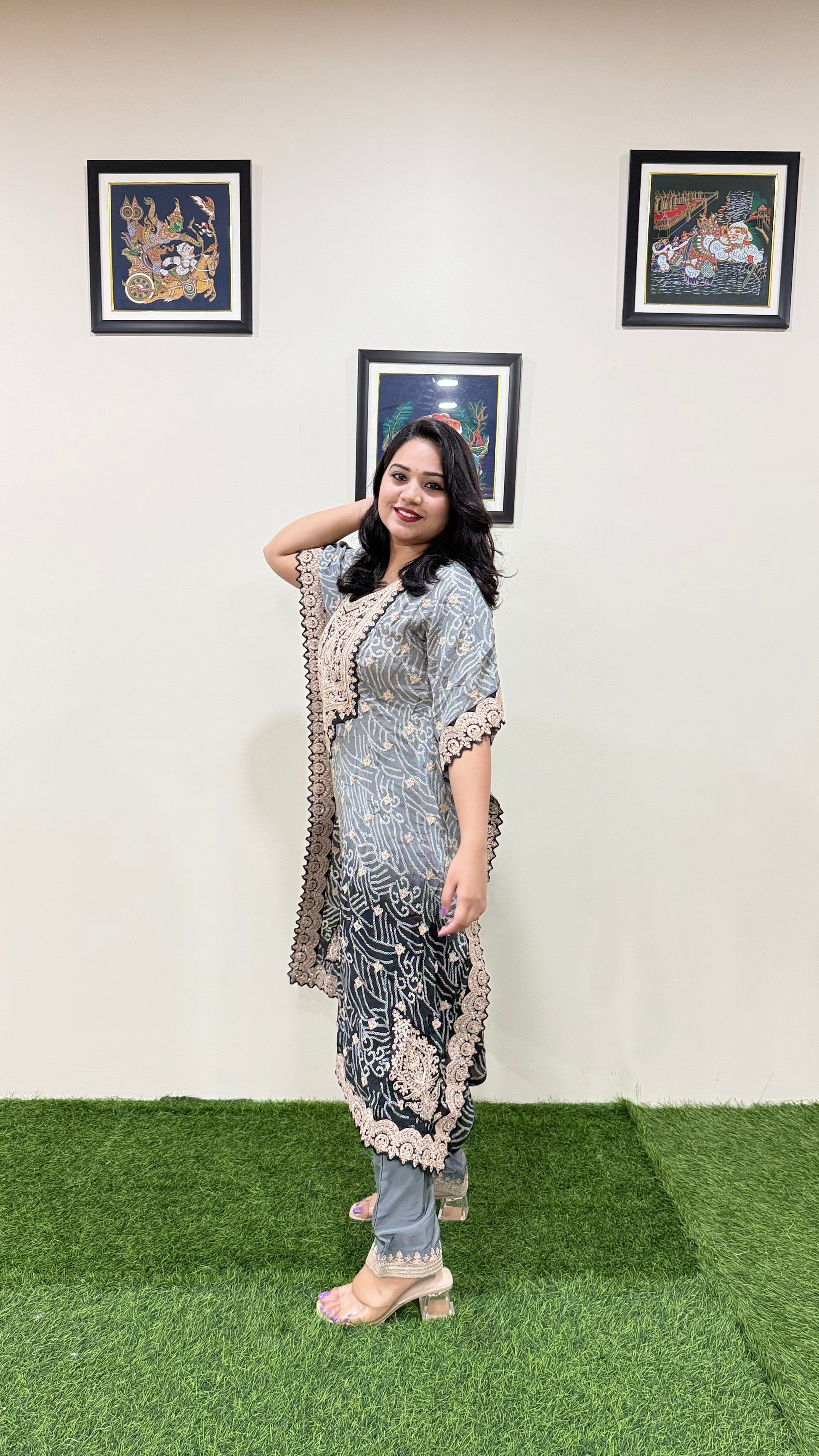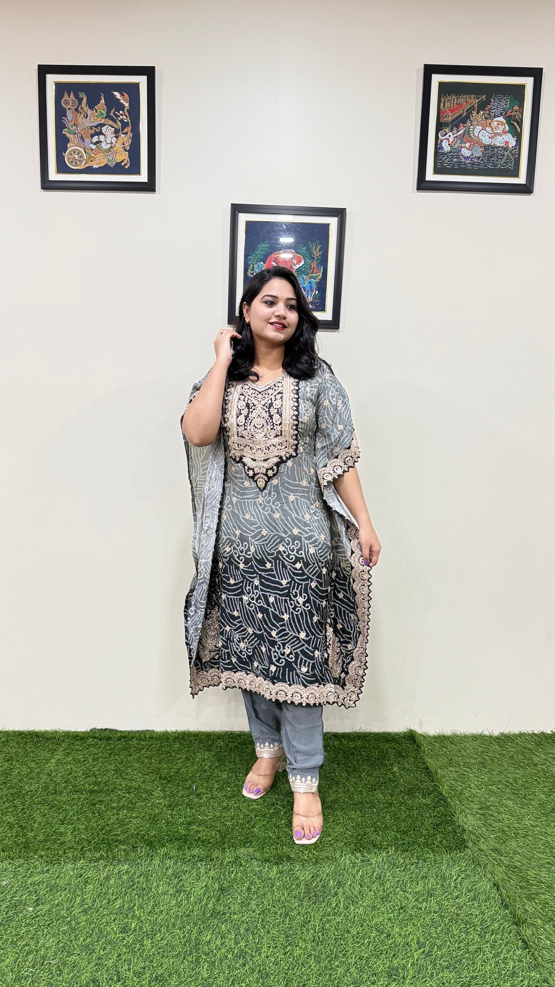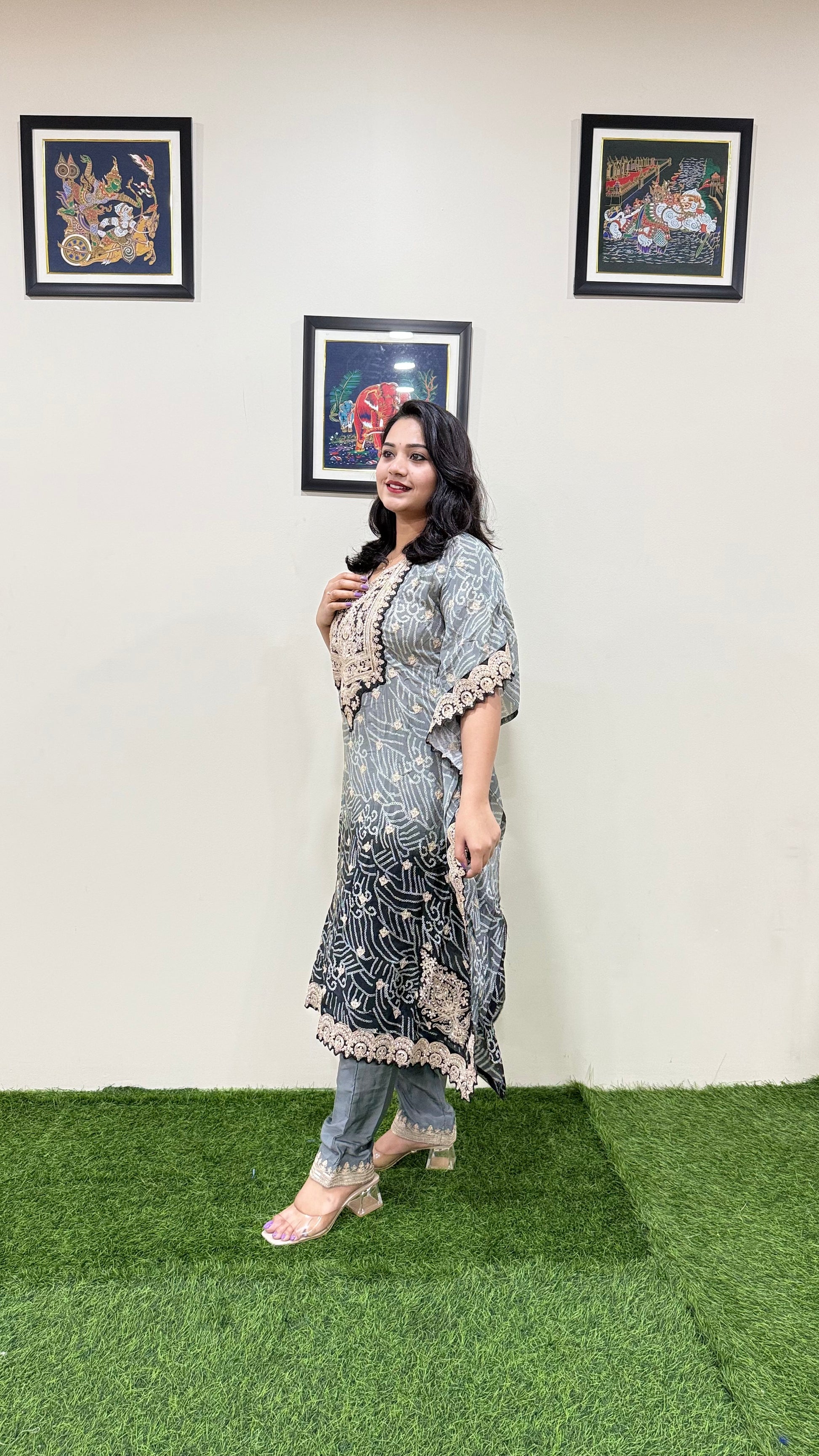 This elegant kaftan-style ethnic outfit is crafted from premium pure viscose natural crepe silk or pure viscose simar organza silk, designed to offer a luxurious fall and smooth finish. Embellished with tulip-style hand mirror work and intricate hand-embroidered gota patti detailing, it blends traditional craftsmanship with contemporary ease. The garment is fully stitched in free size, offering a relaxed fit ideal for festive occasions, special gatherings, or evening events. With its flowing silhouette and rich embellishments, this outfit makes a graceful and impactful statement.