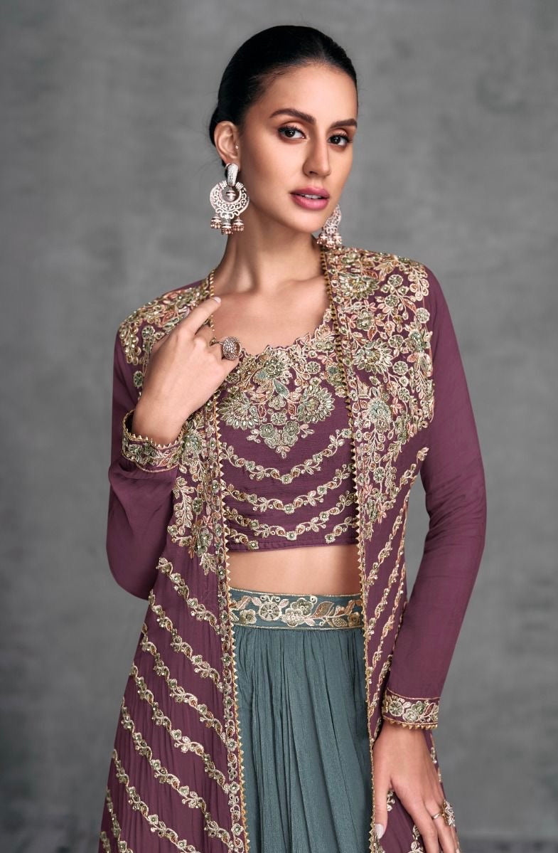 This elegant two-piece ethnic outfit is crafted from premium real chinon fabric, designed to deliver a graceful silhouette and luxurious finish. The top features intricate embroidery that adds a sophisticated edge, while the skirt is enhanced with detailed embroidery and internal cancan layering to create voluminous flair. This set is fully stitched in a free-size format that fits comfortably across multiple body types, making it ideal for festive occasions, weddings, and cultural celebrations.