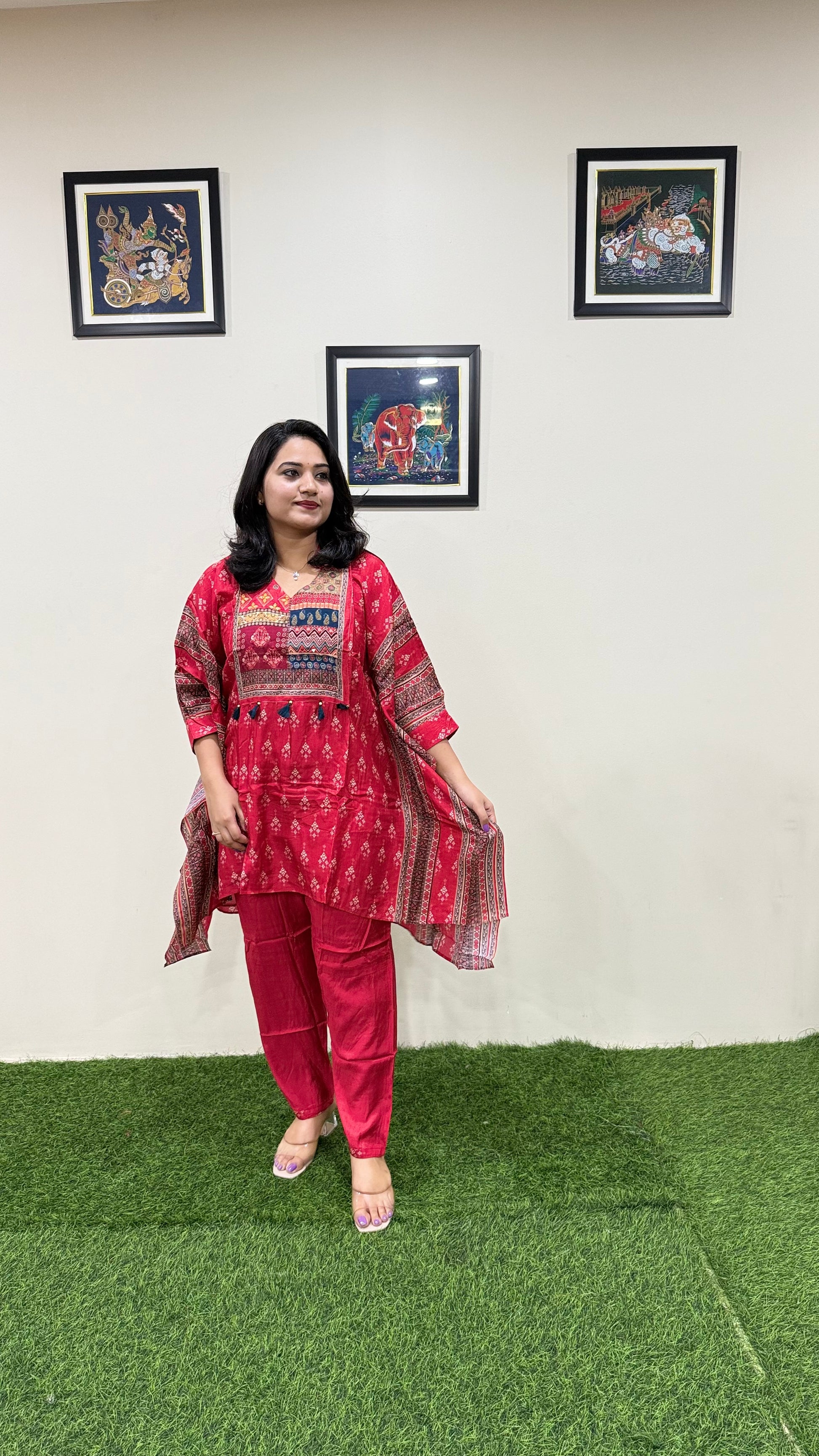 Designer Muslin Digital Print Western Fusion Kurti Pant Set with Mirror and Bead Handwork