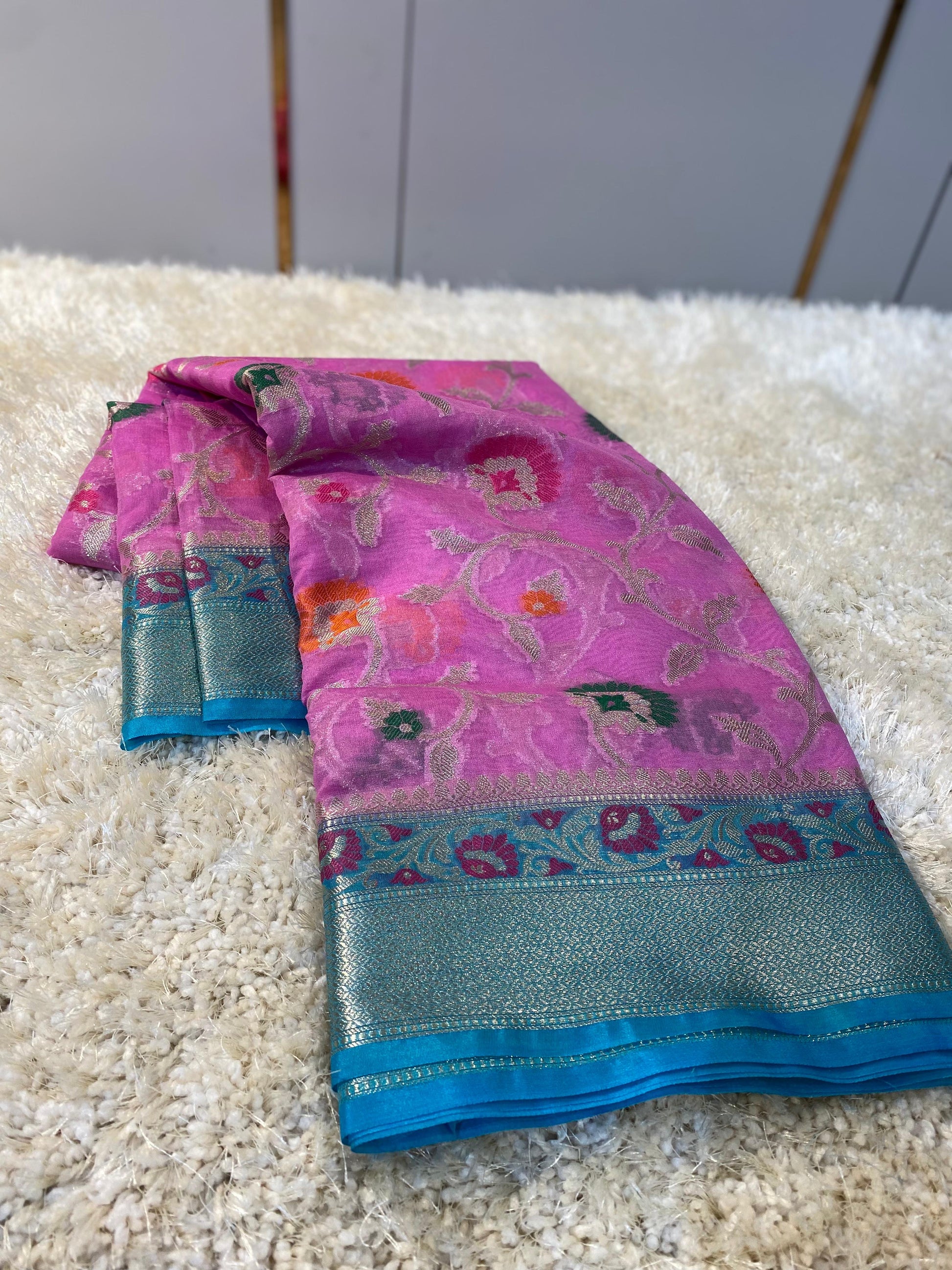 Banarasi Meenakari Georgette Silk Saree with Multi-Color Floral Weaving and Meena Border Blouse