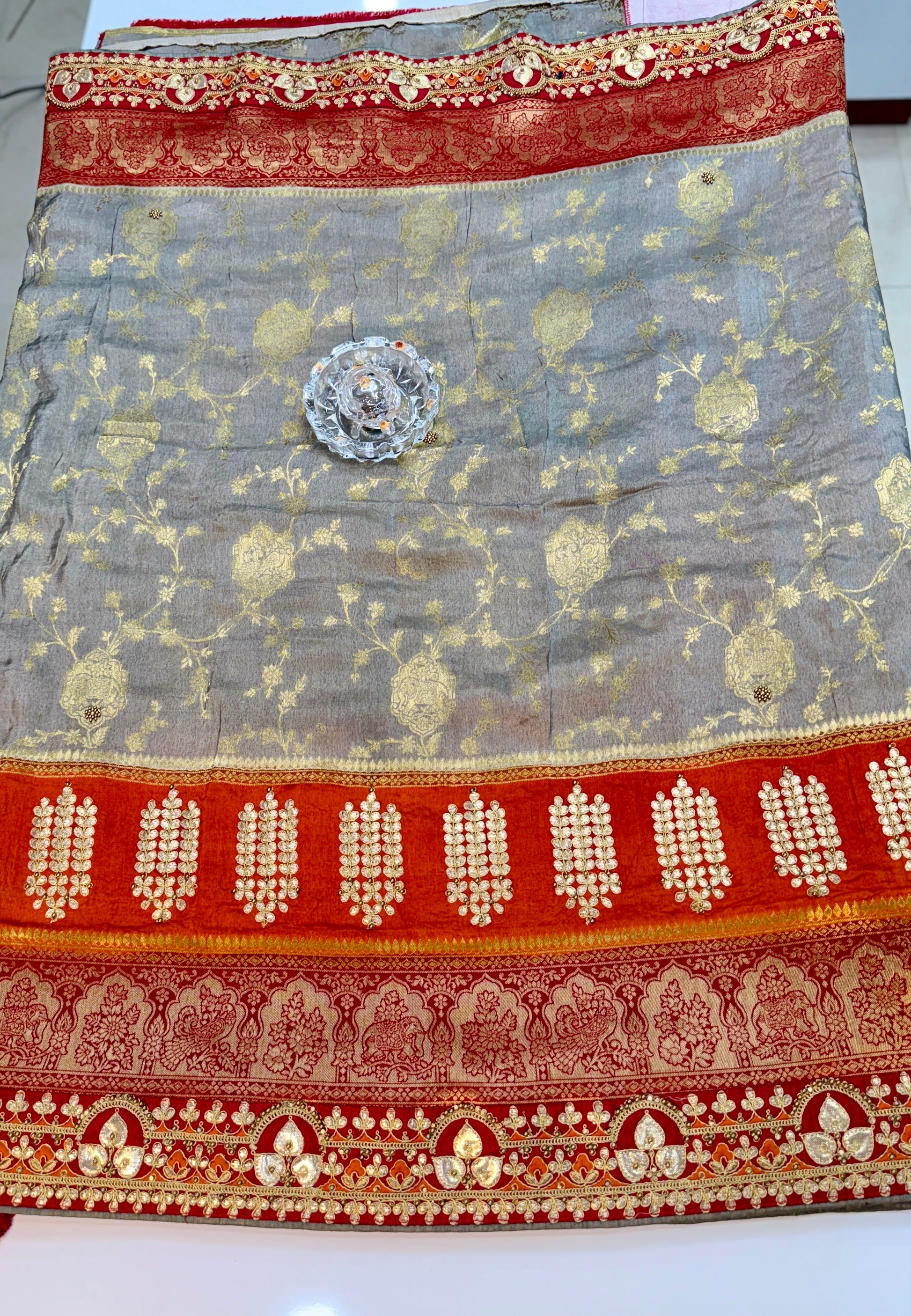 Paired with a luxurious row silk blouse enhanced with embroidery work, the ensemble is designed to stand out at weddings, festive gatherings, and formal celebrations. The craftsmanship and fabric quality reflect heritage weaving techniques fused with contemporary elegance.