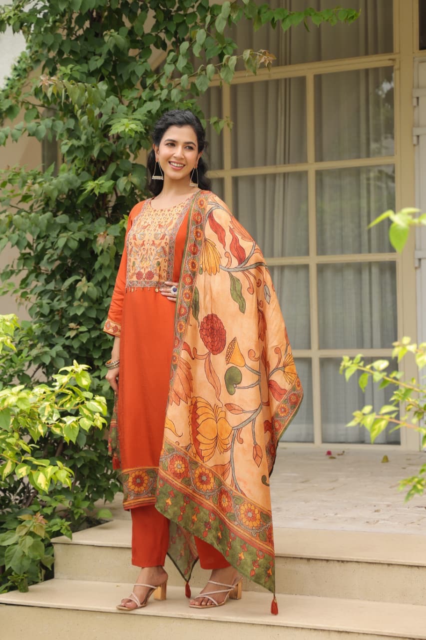 This Dola silk suit set with cotton lining features an elegant printed yoke design and coordinated dupatta with floral motifs. Designed for comfort and style, the set is available in multiple colors and inclusive sizes ranging from 38 to 46. The lightweight silk blend fabric provides a festive look while ensuring day-long comfort, making it suitable for parties, office wear, and cultural gatherings.