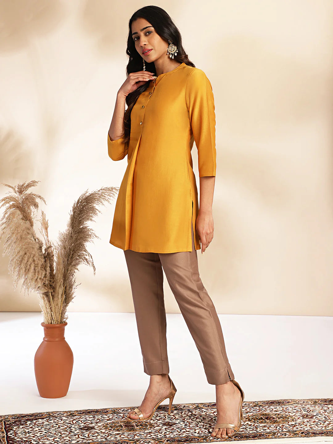 Effortlessly stylish and versatile, this mustard chinnon solid regular kurta set for women brings a refined touch to casual and festive dressing. The short-length kurta is designed in soft chinnon fabric and features a mandarin collar with three-quarter regular sleeves, making it an easy choice for daywear or light celebrations. The set includes contrasting straight-fit pants in a rich metallic brown hue, offering a subtle statement while ensuring comfort. With its clean solid pattern and flattering regular fit, this kurta pant set combines contemporary appeal with traditional roots for everyday elegance.