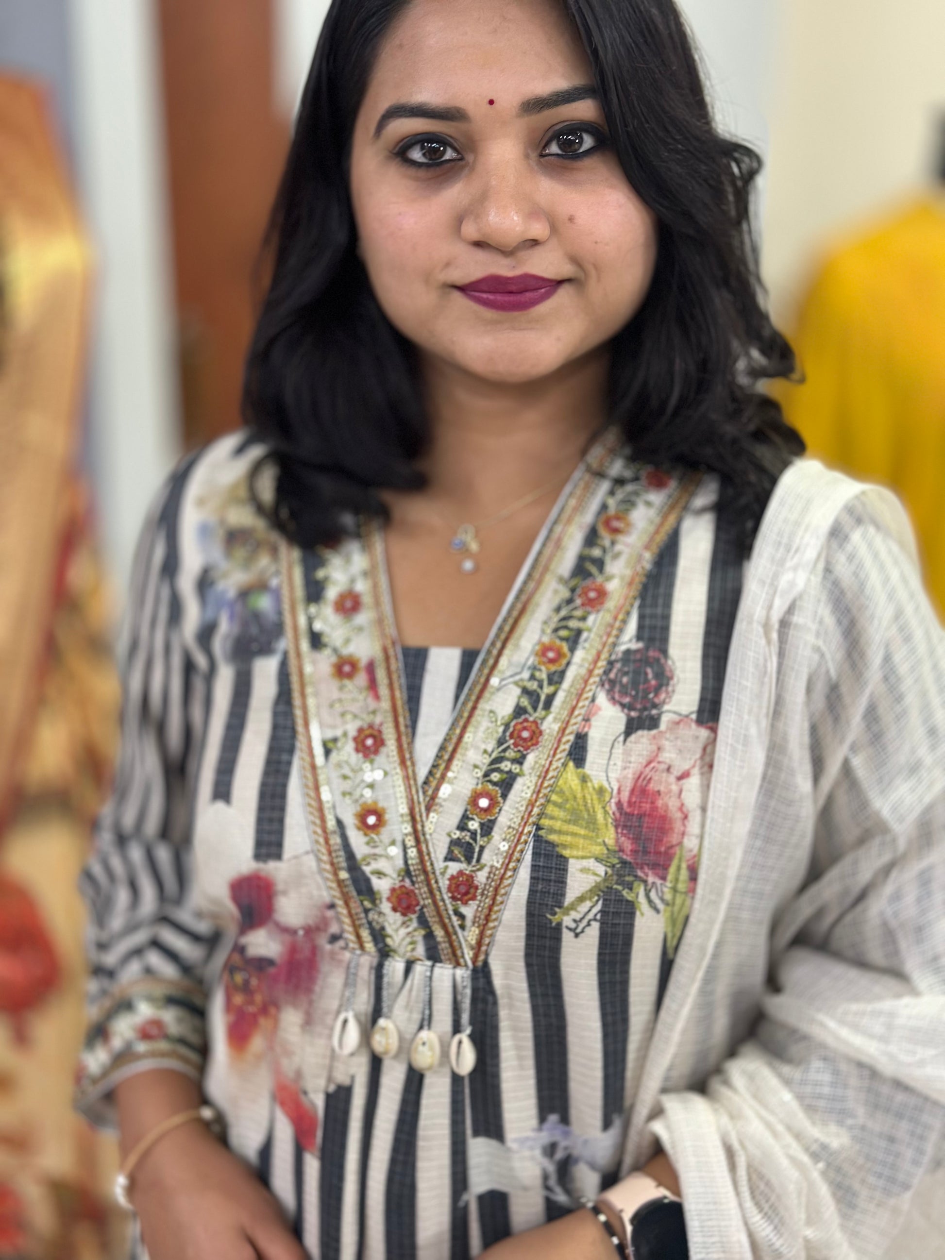 This elegant Kota Doria suit set combines traditional weaving with intricate detailing for a refined festive look. The A-line kurti features a striped pattern enhanced with thread, sequin, and mirror embroidery around the neckline, complemented by designer sleeves for added sophistication. An attached cotton lining ensures breathable comfort for all-day wear. The set includes straight-fit cotton pants with functional pockets, blending style with practicality. Completing the ensemble is a classic Kota Doria dupatta, adorned with tassels for a graceful finishing touch. Designed for weddings, festive occasions, and cultural gatherings, this outfit reflects a perfect balance of heritage and contemporary fashion.