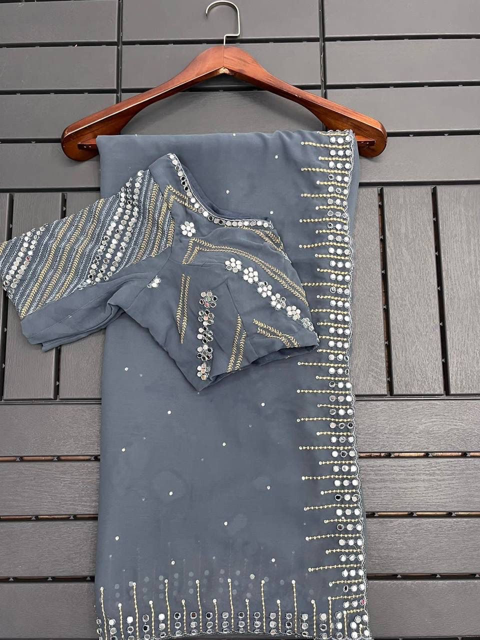 SEO Keywords: Pure georgette mirror work saree, embroidered saree with blouse, festive saree for women