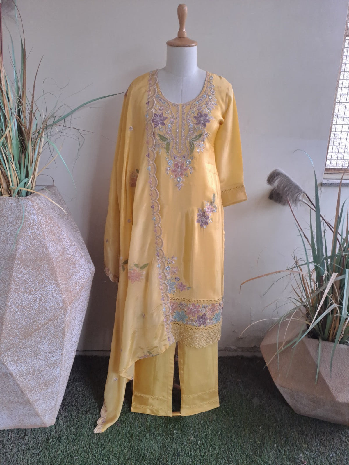 - Fabric Type: Kurta – Glass Organza with Cotton Lining; Pant – Shantoon; Dupatta – Glass Organza with scallop design