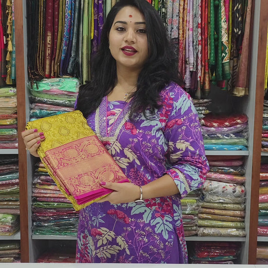 Crafted in the weaving heartland of Kanchipuram, this pure silk wedding saree reflects centuries-old heritage and artistry. Made from 100% pure silk and handwoven by skilled artisans, the saree features intricate traditional zari motifs woven across a vibrant palette. Designed for weddings and grand celebrations, it embodies cultural richness and ceremonial grace. With every drape, this saree offers elegance, comfort, and heirloom-worthy charm.