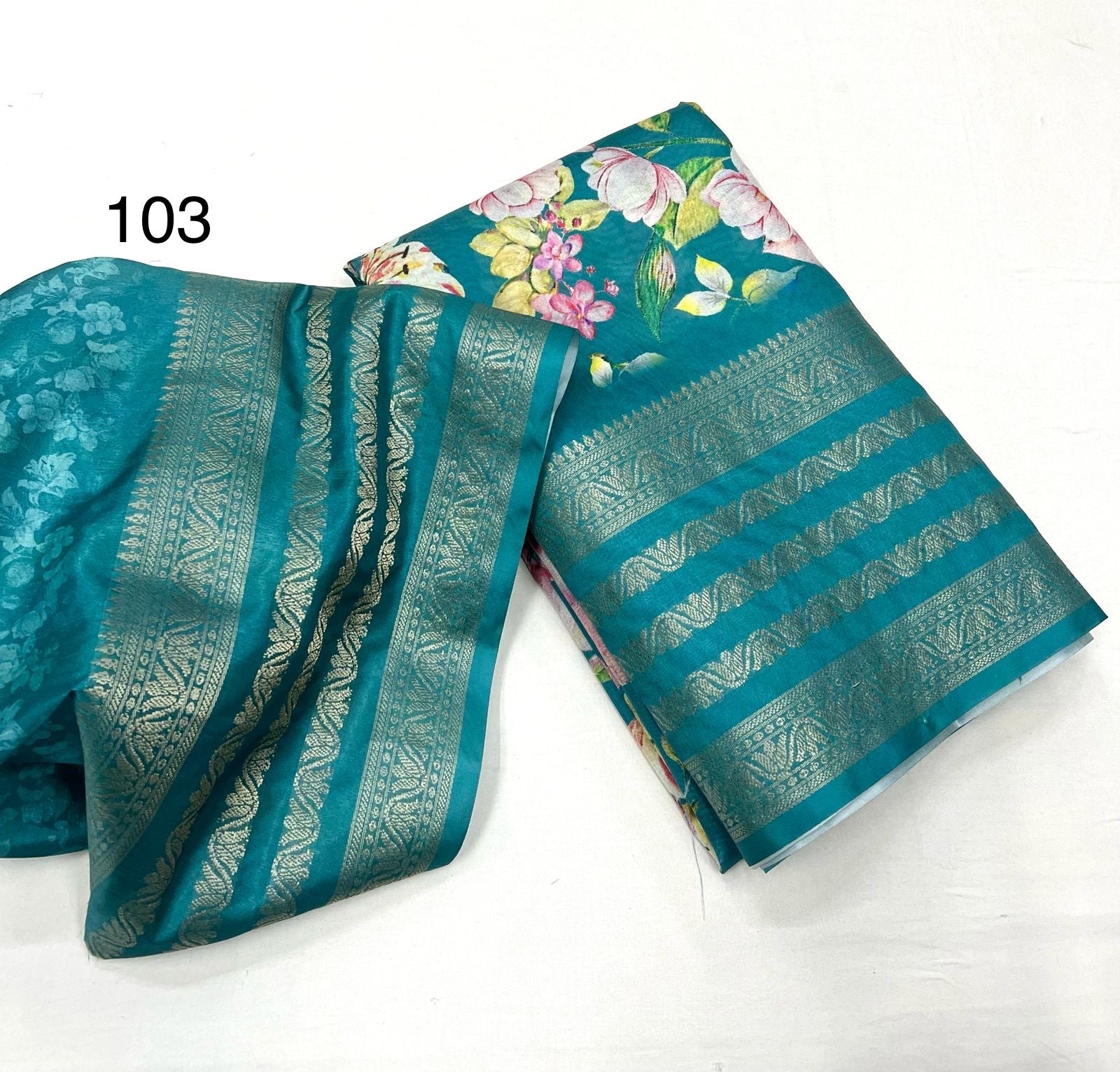 Crafted from luxurious Soft Dola Silk fabric, each saree features a stunning digital floral print, enhanced by a Jacquard weaving border.