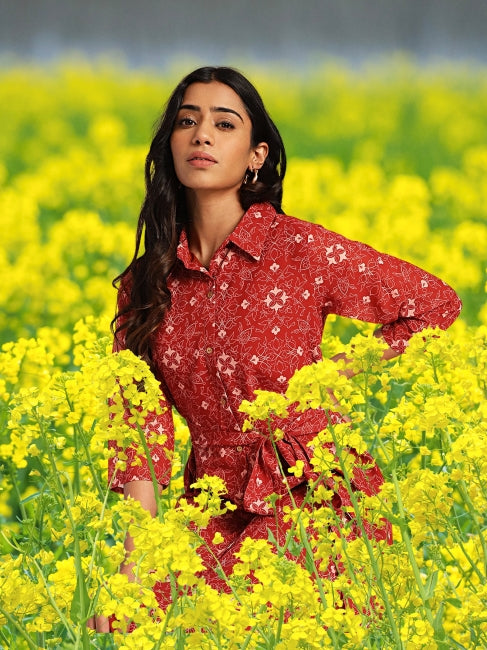 Design & Work: Floral printed pattern, shirt collar, button-down front, and waist tie belt