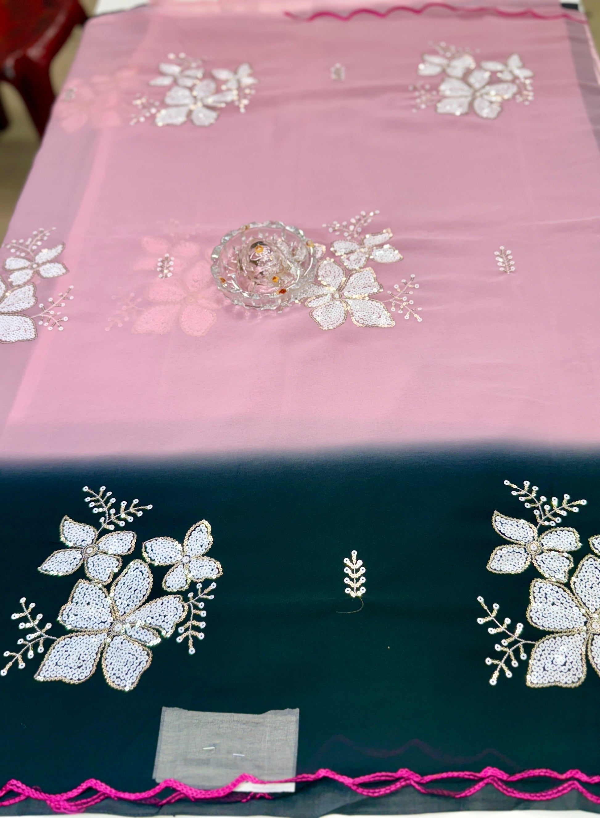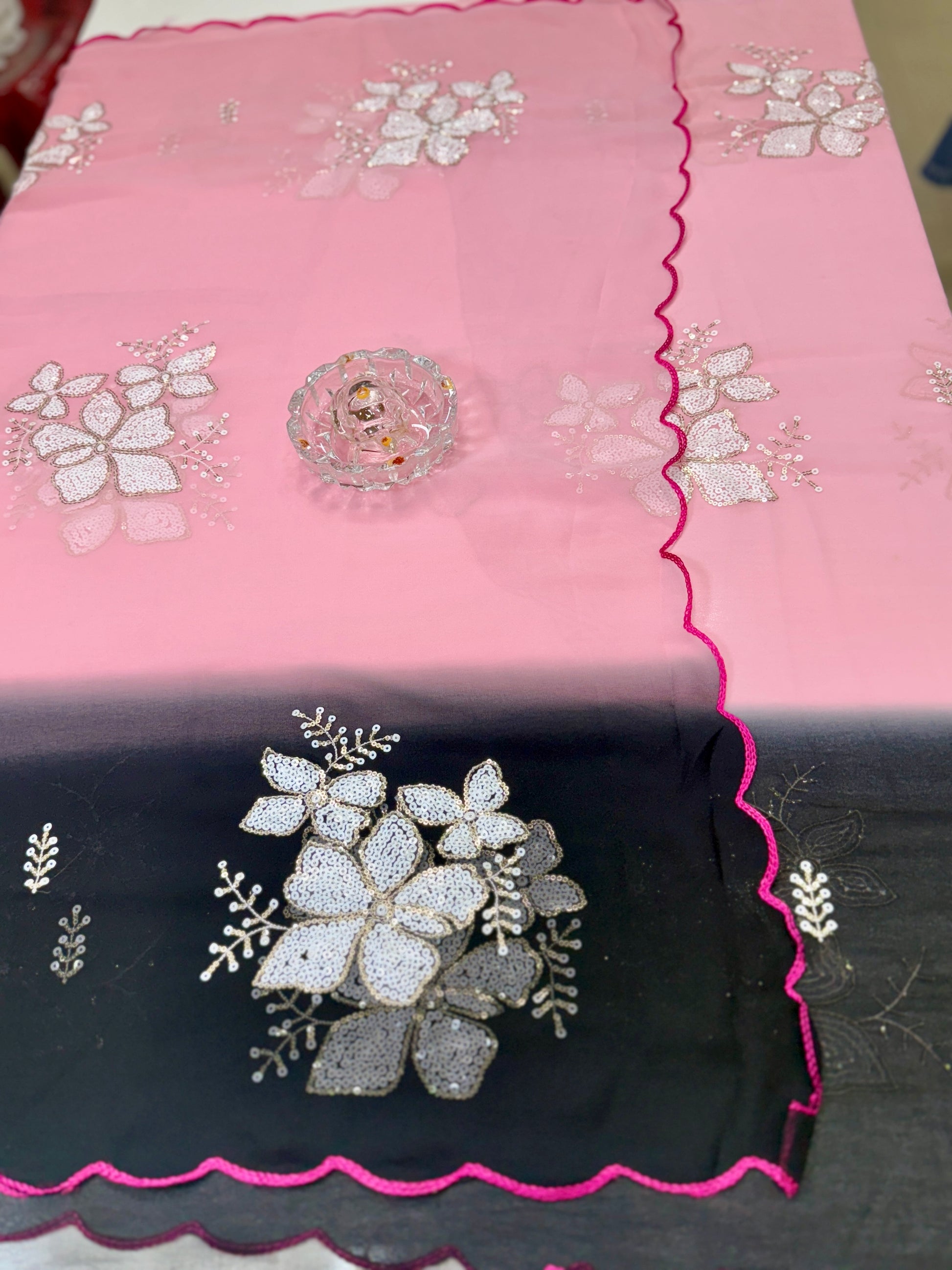 This saree is crafted in georgette fabric and paired with a lustrous ultra-satin blouse piece, blending elegance with comfort. The lightweight drape of georgette makes it perfect for long festive occasions, while intricate floral embroidery across the saree enhances its appeal with fine craftsmanship. The scalloped edging adds a tailored finish, giving the ensemble a polished and refined look.