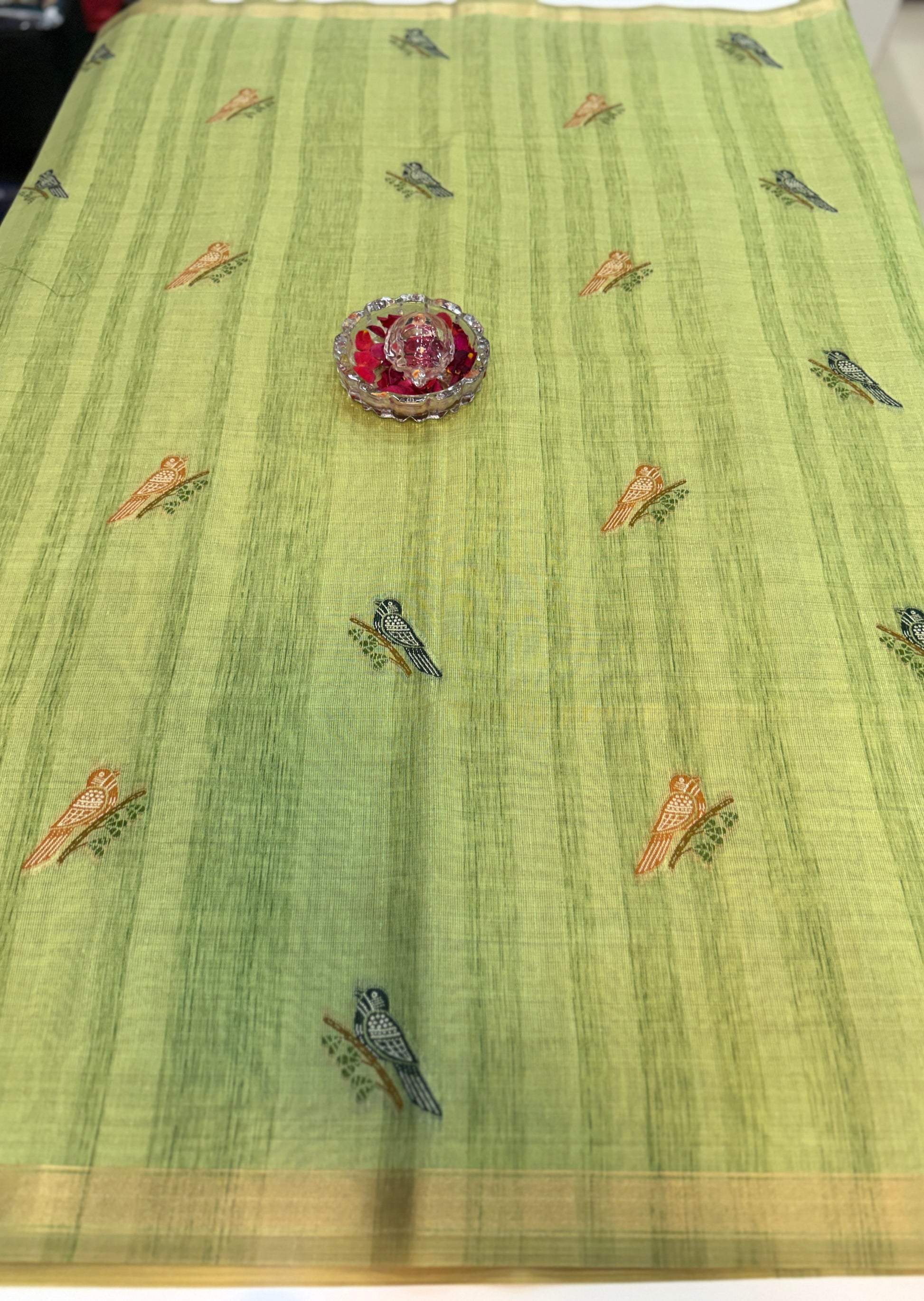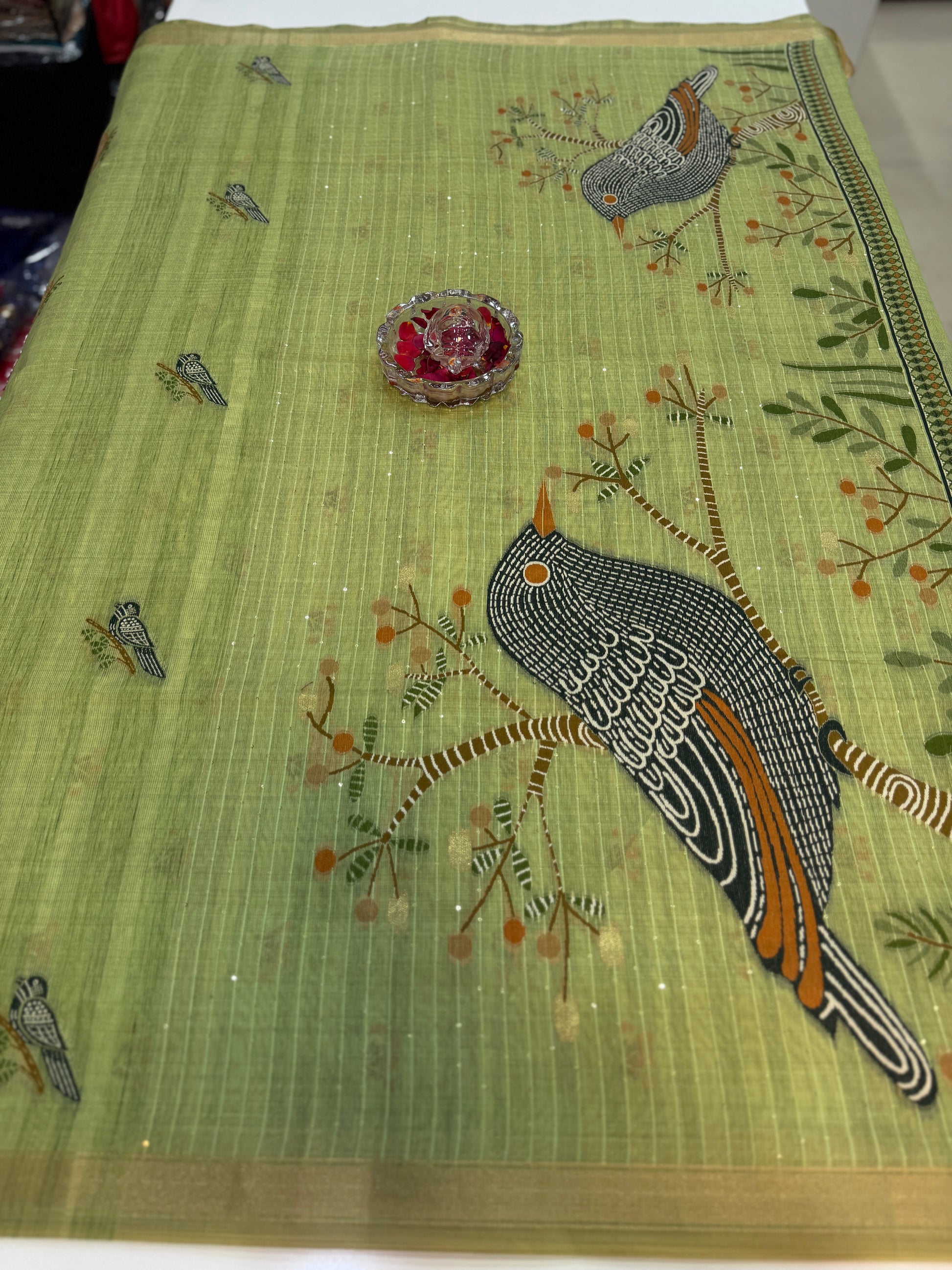 Design: printed body with small motifs; bird-and-floral pallu design