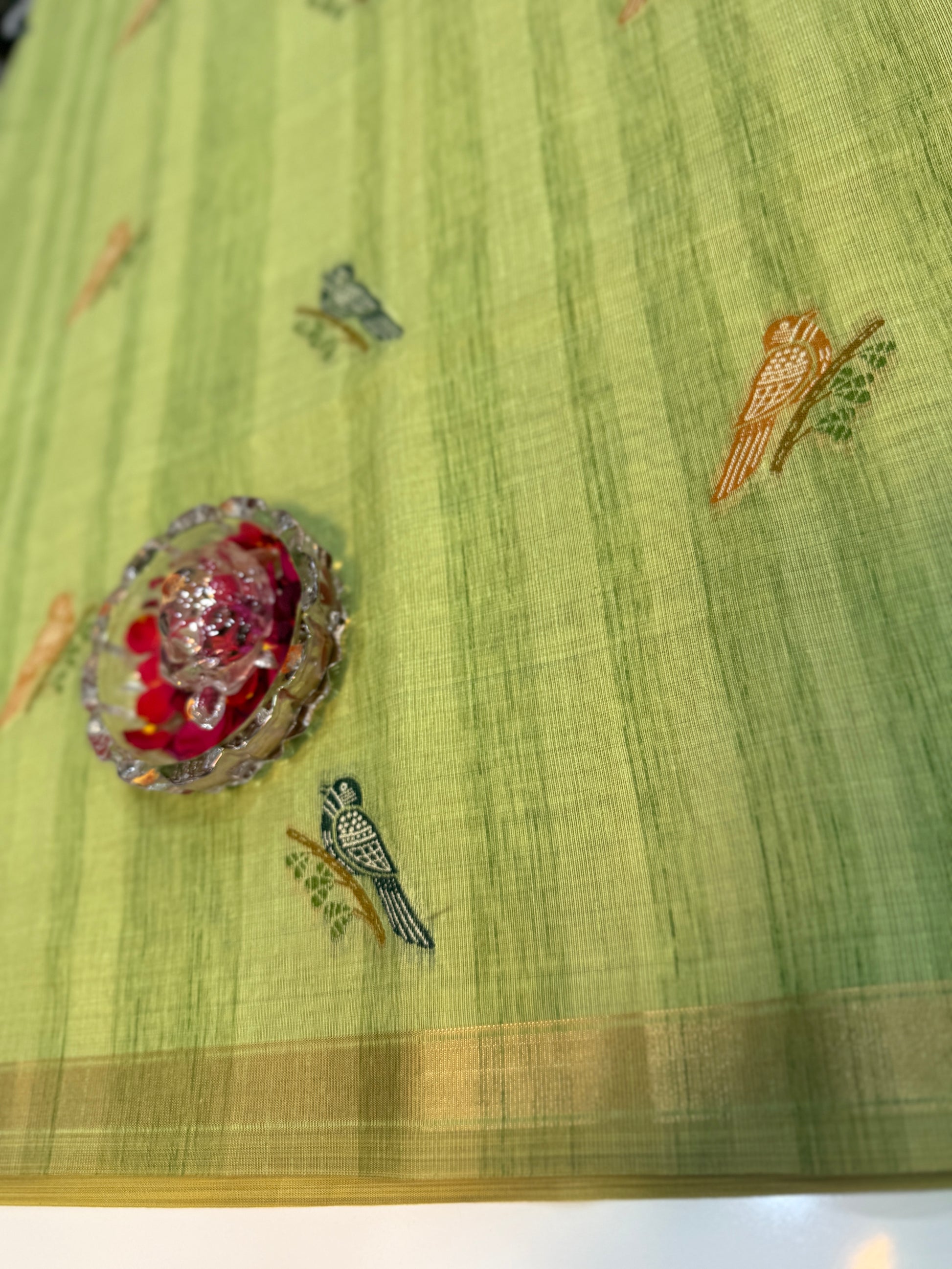 Styling keywords: printed cotton saree, bird motif saree, statement pallu saree, lightweight saree for women