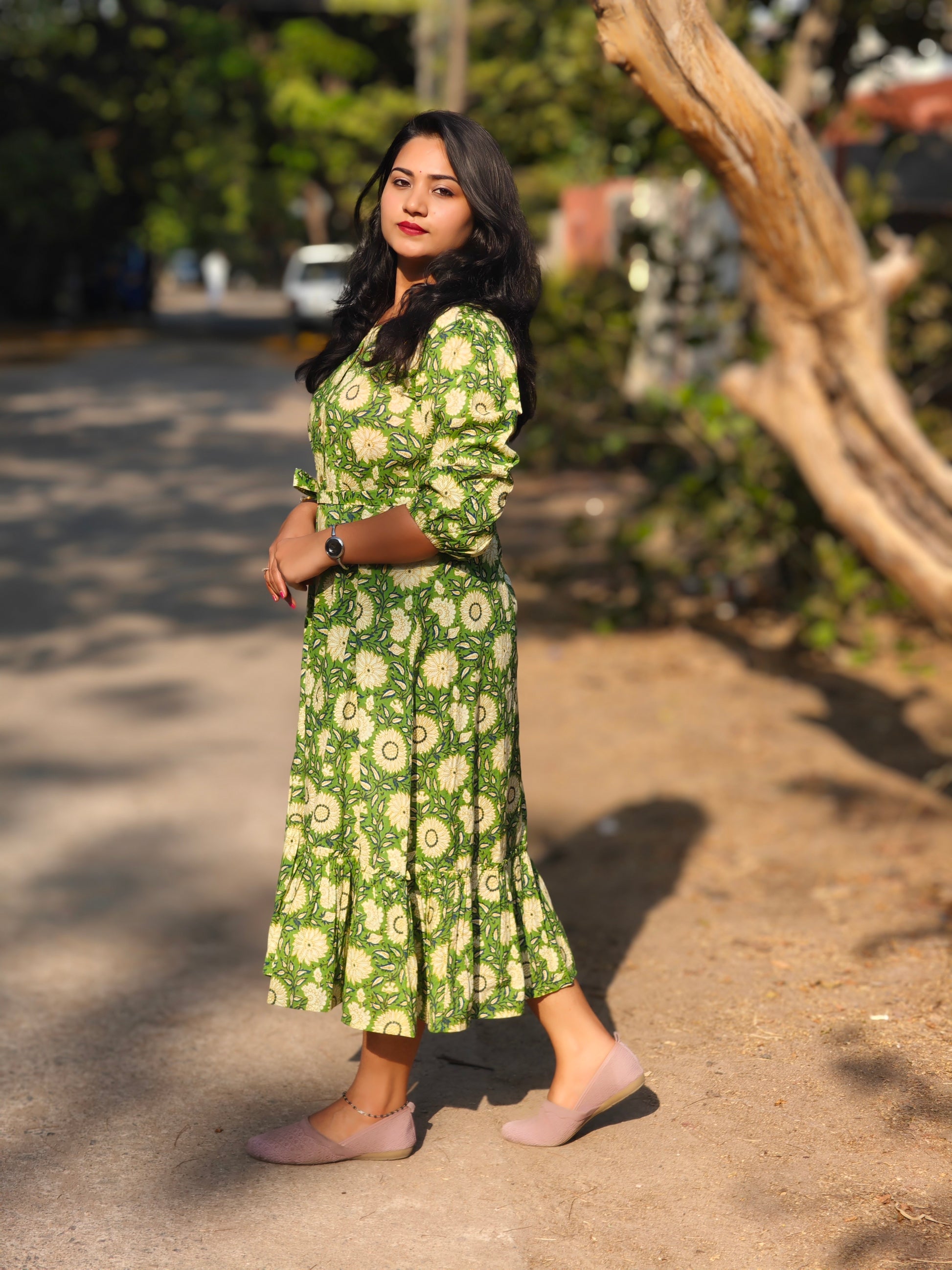 SEO Keywords: green cotton floral midi dress, A-line cotton dress for women, casual printed cotton dress L to 3XL.
