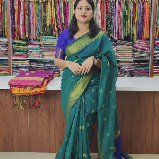 Celebrate traditional craftsmanship with this handloom Maheshwari silk cotton saree, woven for a soft texture and graceful draping. The body features all-over mango butta motifs, while the shimmering gold zari border adds a touch of festive elegance. Paired with a contrasting unstitched blouse piece, this saree balances heritage weaving with everyday comfort.