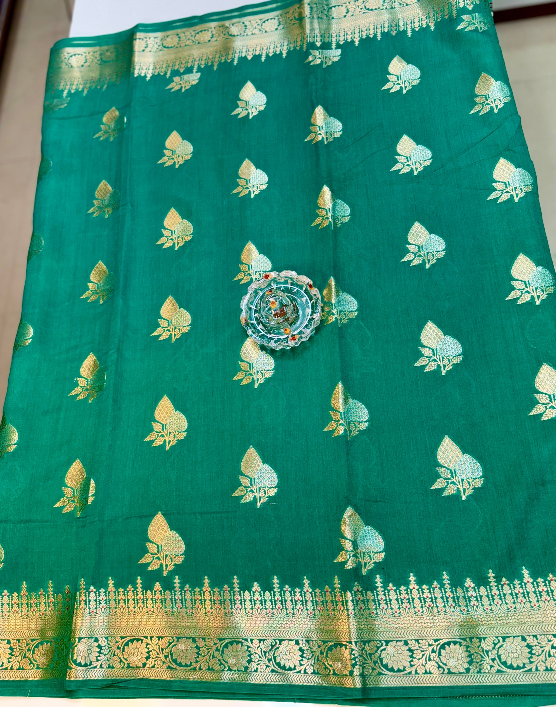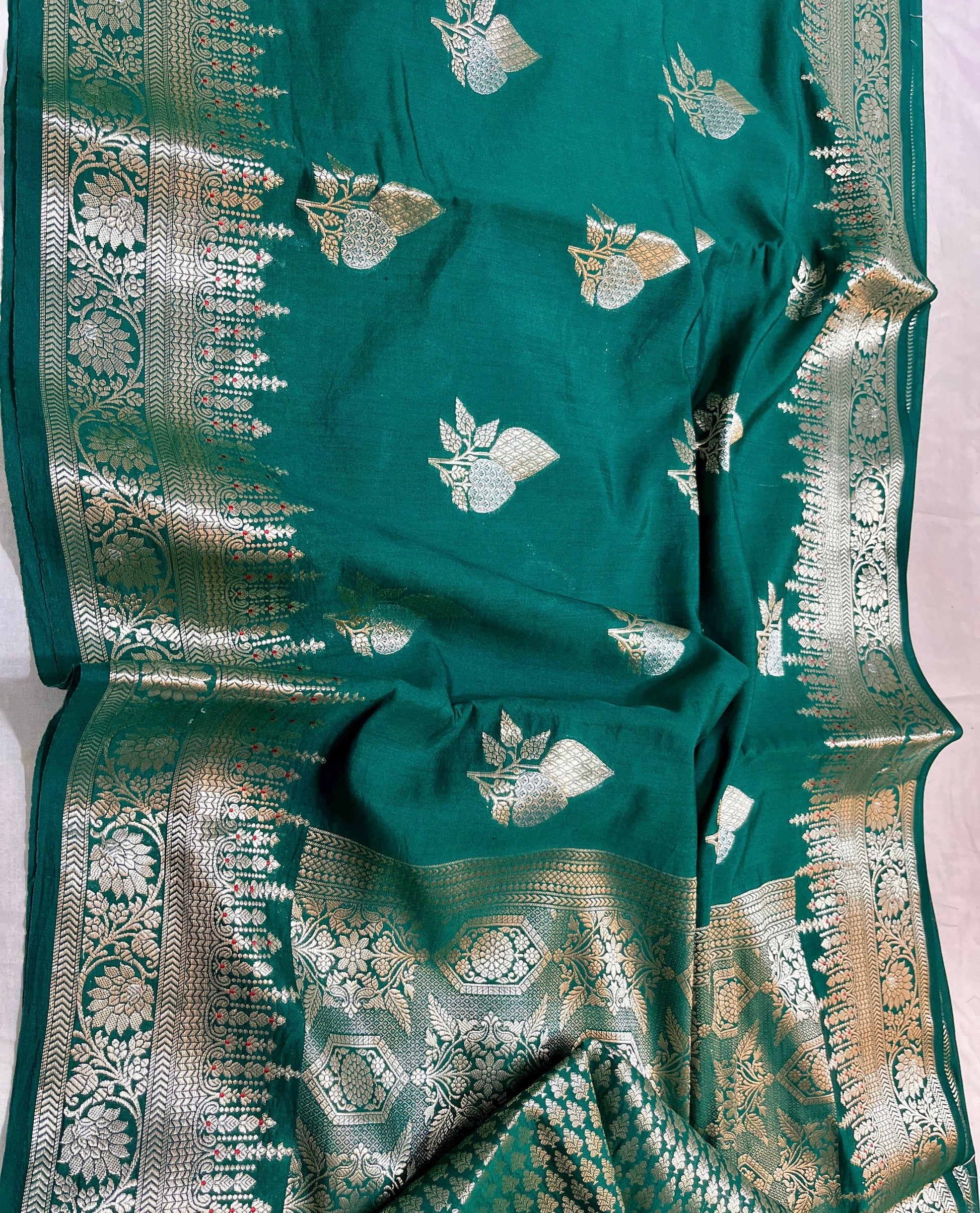 Handloom Pure Chhiniya Silk Saree in bottle green with Meenakari Zari Weaving and Buta Work