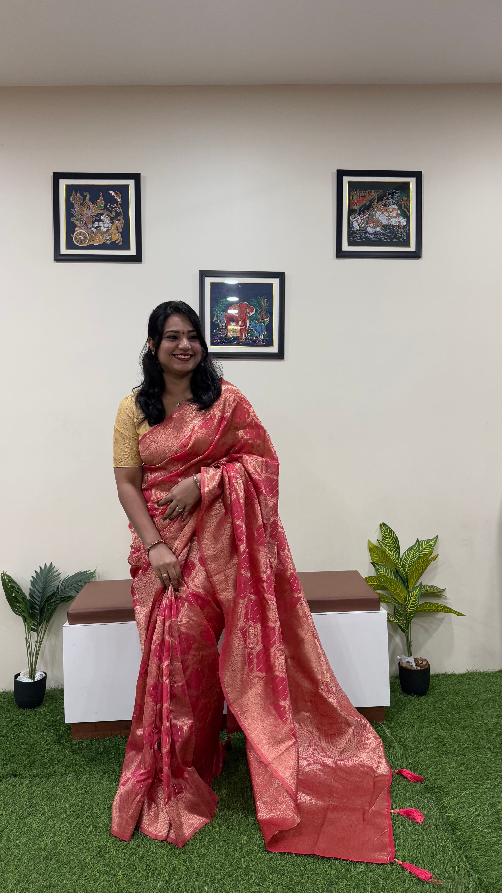 Heavy Red Organza Woven Saree with Golden Zari Border and Tassel Pallu