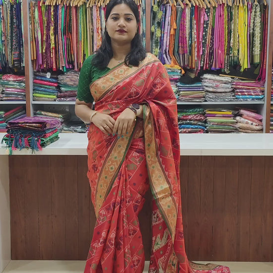 Ikkat Patola Silk Saree is a masterpiece of weaving tradition, combining the intricacy of Patola artistry with the elegance of Kanchipuram-inspired borders. Crafted from premium handloom silk, it features an all-over ikkat design woven with precision, embodying both heritage and sophistication.