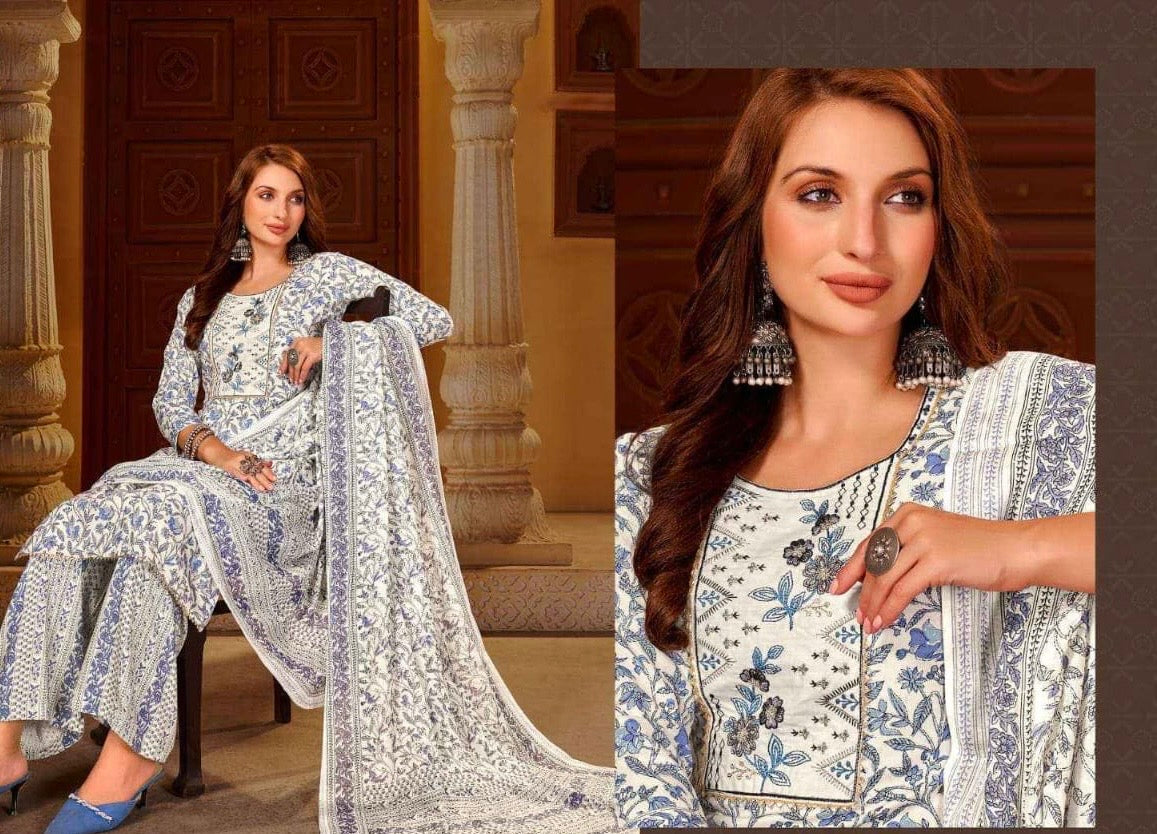 This unstitched women’s dress material set showcases traditional Jaipuri craftsmanship blended with breathable rayon fabric, making it perfect for both festive and daily ethnic wear. The top is crafted from rayon fabric, enhanced with detailed embroidery and delicate handwork, creating a sophisticated and elegant look. The bottom is made of matching rayon fabric, providing both comfort and durability for tailored outfits. Completing the set is a mal print dupatta, designed with a soft texture and traditional charm, adding a graceful finishing touch.
