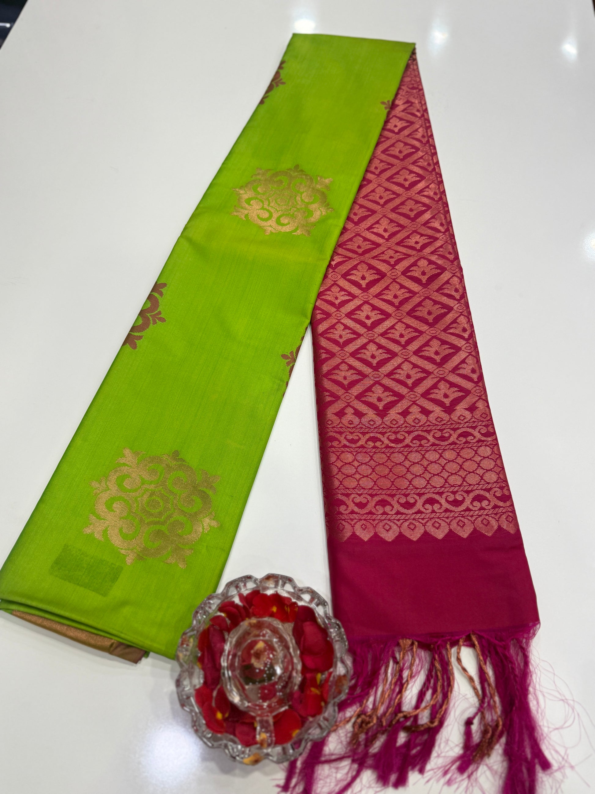 The Kanchi Soft Silk Saree is a refined showcase of South Indian weaving artistry, blending tradition with sophistication. Crafted from premium soft silk, it offers a smooth, lustrous texture that drapes gracefully, ensuring comfort while maintaining regal elegance.