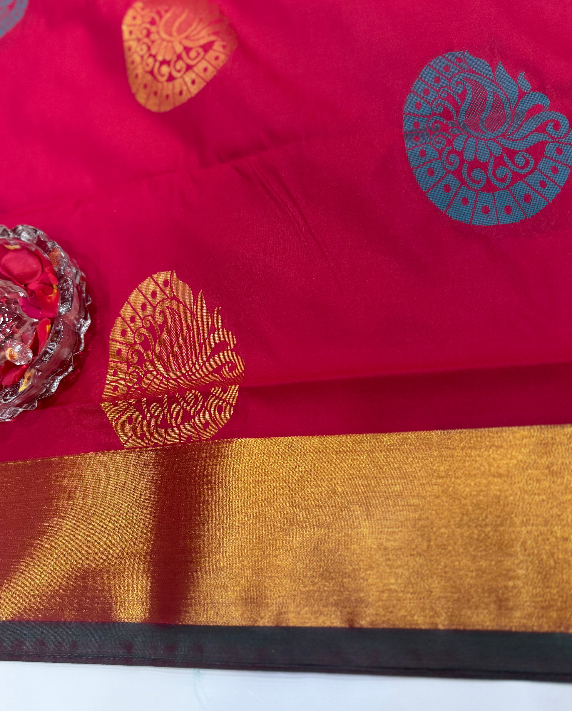 • Border & Pallu: Richly woven border with a radiant zari pallu.